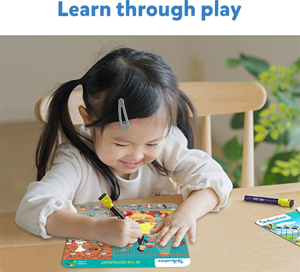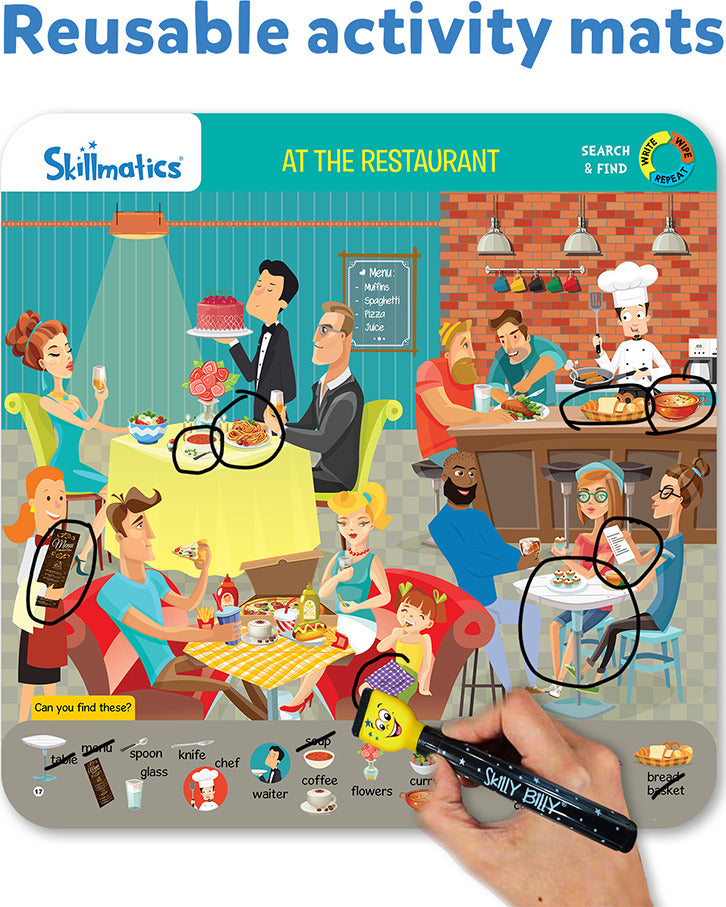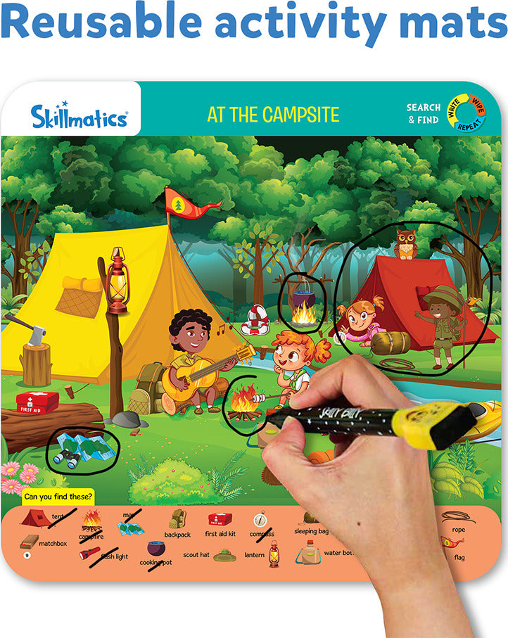 A top-preschool learning activity, Skillmatics' Search & Find Activity Mats encourages children to use their observation and fine-motor skills to explore richly-illustrated scenes to search for objects and learn about different environments, people, habitats, animals, dinosaurs, and more. Designed for independent, screen-free learning for curious preschoolers, the high-quality dry-erase mats are the perfect platform for practice and skill development. Preschoolers will learn about 20 different environments including an amusement park, under the sea, a medical center, and more as they build their vocabulary along the way. Includes 10 double-sided mats, 2 dry erase markers, 1 cleaning cloth, and achievement certificate. Ages 3-6.