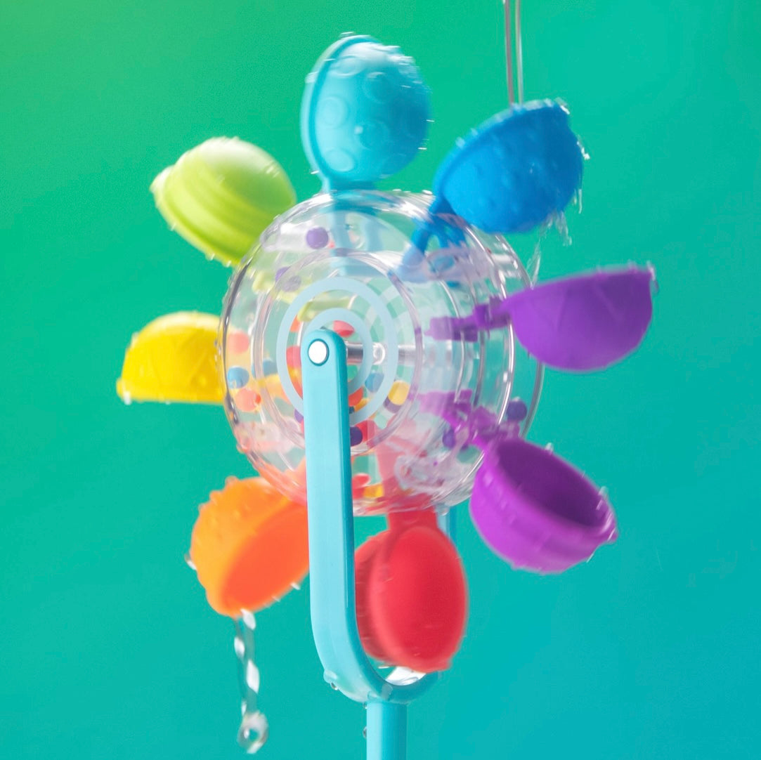 - Spinning wheel encourages baby’s natural batting action. Soft colorful cups move as baby pours water over, teaching concepts of movement and re-action.