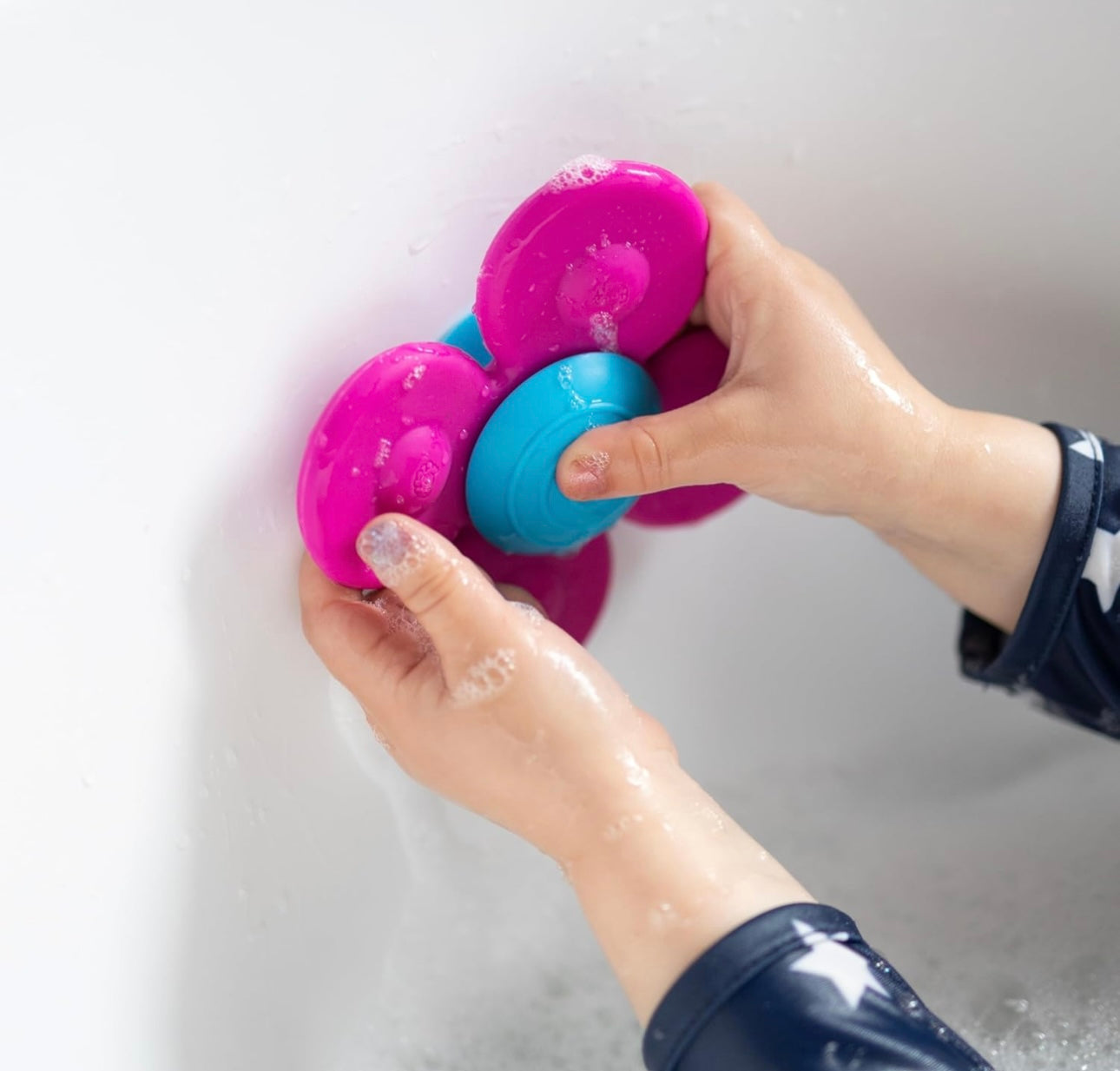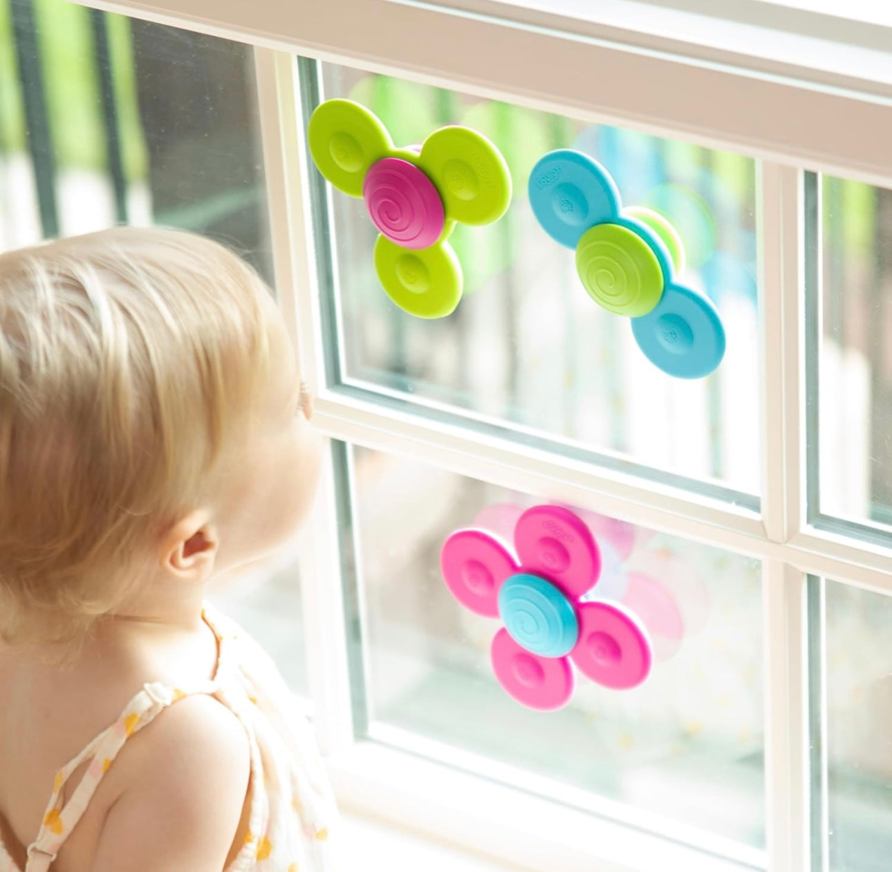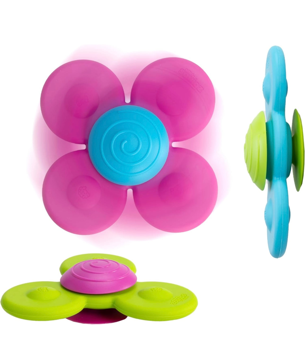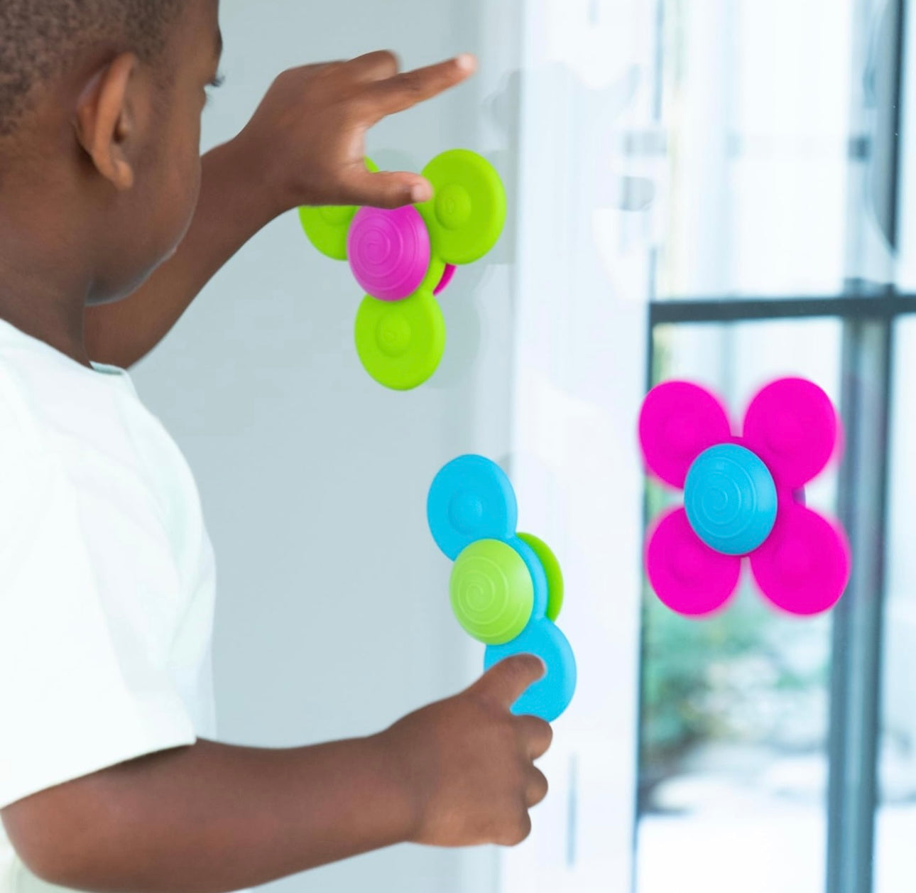 They twirl and whirl in a swirl! These colorful spinners, with a textured dome on one side and a suction cup on the other, that lets them stick to any flat surface, are fun to touch and safe for teething. Stick this trio of mesmerizing spinners to any flat surface - tabletop, bathtub, window - and watch the wheels of sensory exploration start to spin. Three Whirly Squigz of long-lasting durability, quality and safety included: one with 2 petals, one with 3, and one with 4. Made of 100% food-grade silicone.