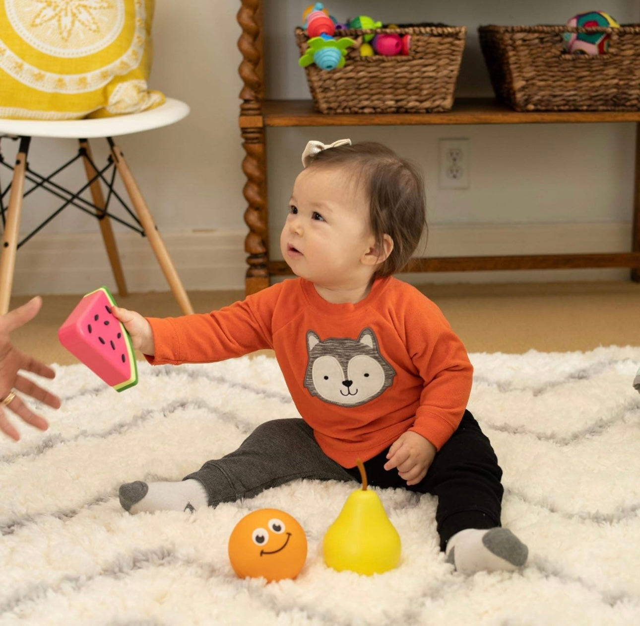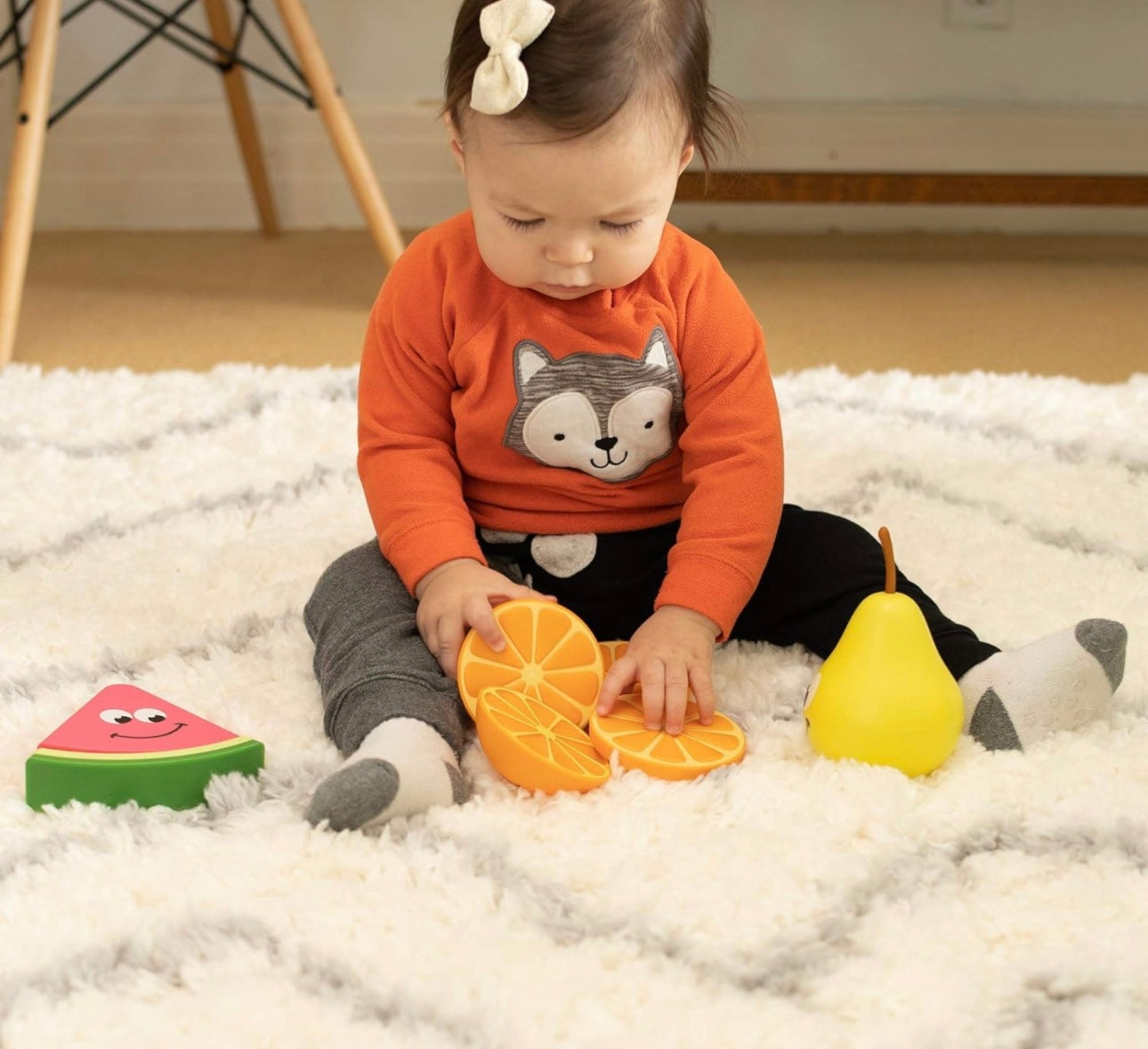 Nourish the senses! These friendly fruits each feature another unique experience for little learners to explore. The orange comes apart into four thick slices that snap back together with magnets. The watermelon pieces stack atop a teeter-tottering peg base while silicone seeds fascinate the fingers. Then there's the pear - Send it wobbling and listen as the chimes inside sing! With the Fruit Friends, sensory fascination abounds. Fruit Friends Set of 3 fruit toys each featuring another sensory experience Encourages fine motor skills, sensory learning, tactile learning, cause-effect learning, imaginative play Little ones giggle with each new discovery! Orange comes apart into four slices that snap back together with magnets Watermelon pieces stack atop teetering peg base, features silicone "seeds" Pear wobbles wonderfully, features built-in chimes, silicone stem Includes orange (4 pieces), watermelon (3 pieces), pear (1 piece) Orange measures 3.25 inches in diameter Watermelon measures 4.5 x 4.75 x 1.25 inches Pear measures 5.5 x 3.5 x 3.5 inches High quality materials and construction - Lasting durability