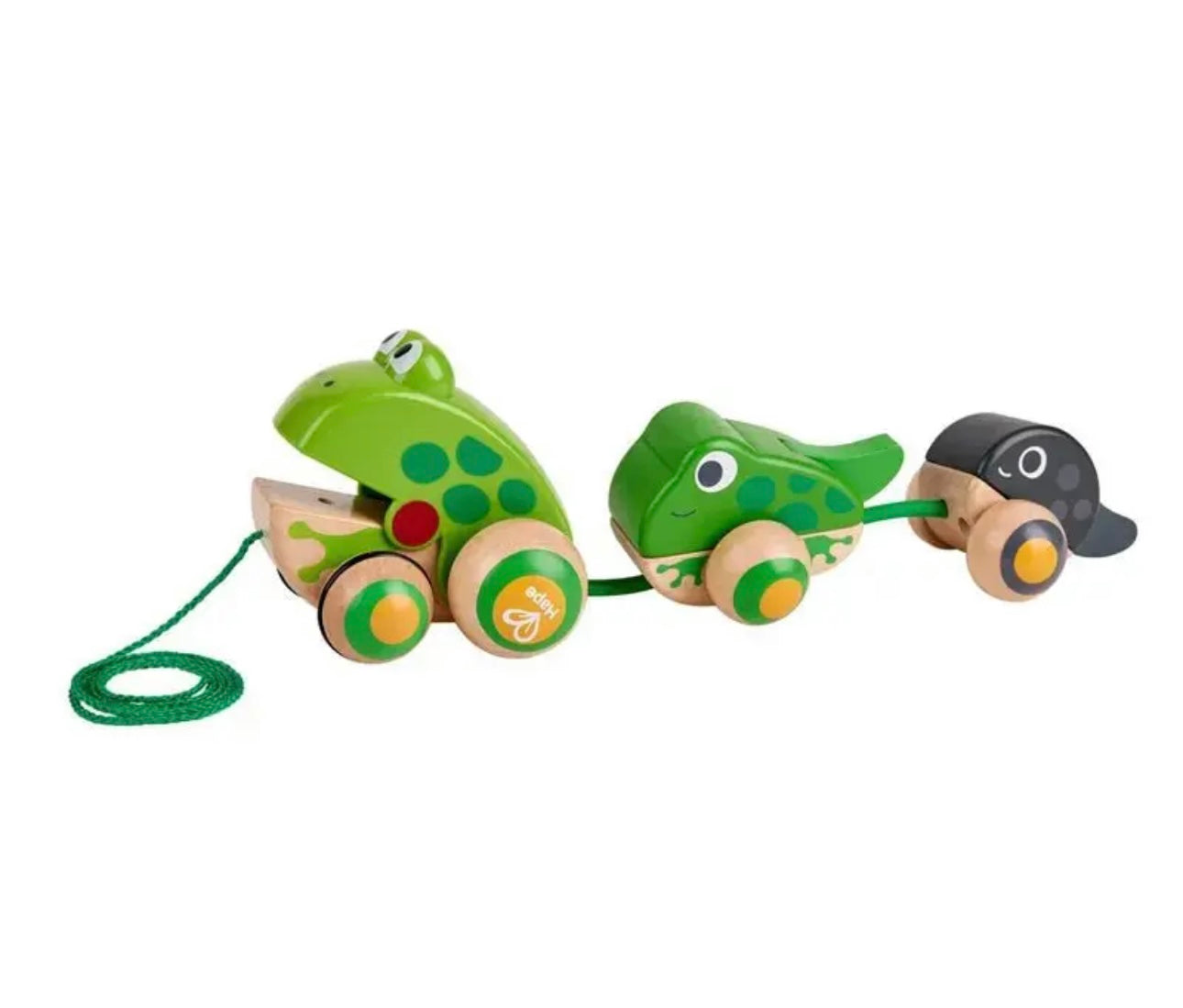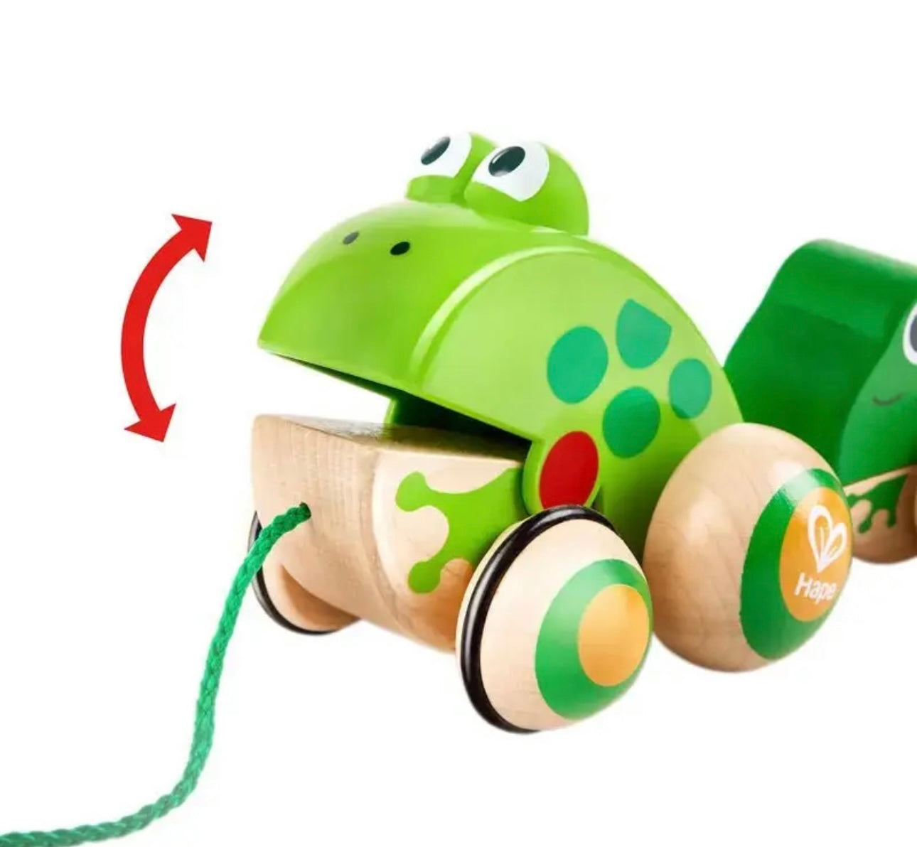 This lovely mama frog is taking her little ones for a walk. Pull the string and watch her open & close her mouth. As you pull this frog family,you will see mama walk with her froglet and little tadpole wobbling along behind.