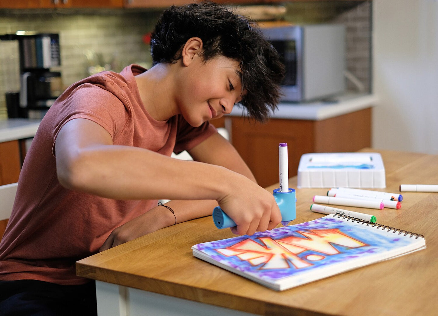 The kit includes everything you need to start creating right away: 1 cordless airbrush device, 10 washable dual-tip markers, 2 reusable stencils, and a charging cable.