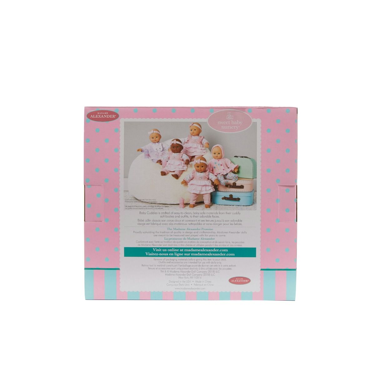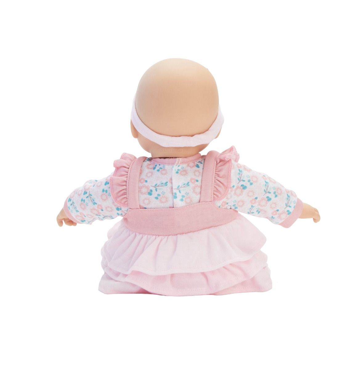 This 14" baby doll has a dark skin tone, brown eyes, and a soft-body with vinyl limbs. The doll wears a floral tee, a ruffled pinafore with floral embroidery, stripe leggings, and a headband with a bow. The baby comes with a bottle and is easy to clean with a damp cloth.