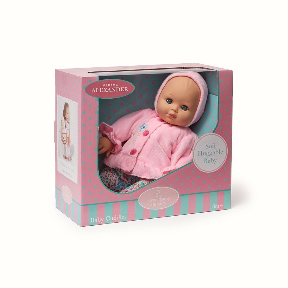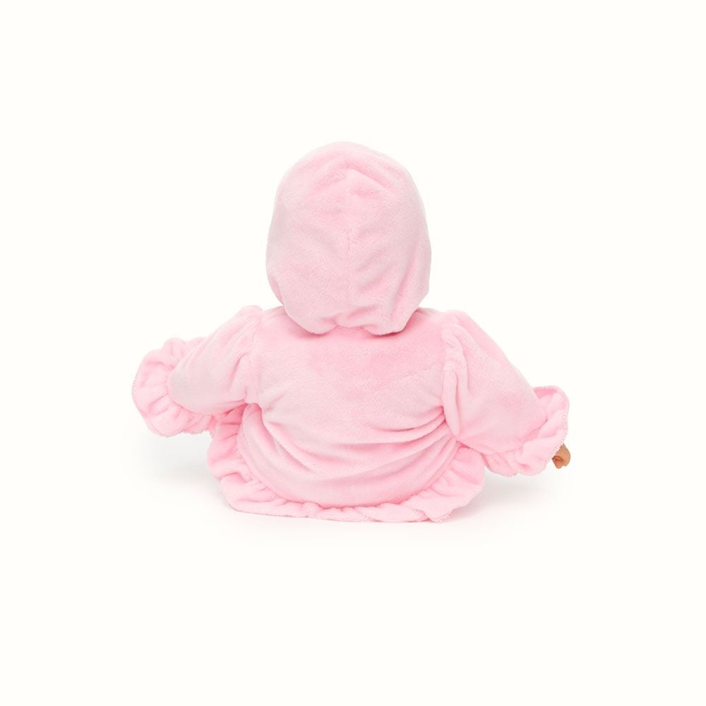 Dressed in flower printed tights and a soft pink plush hooded jacket with flower accents, this 14” cutie is ready cuddle. Her beautiful face with painted features peeks out from under the hood, while her fabric body is perfect for tiny hands to hug with extra love. Age 18 months+