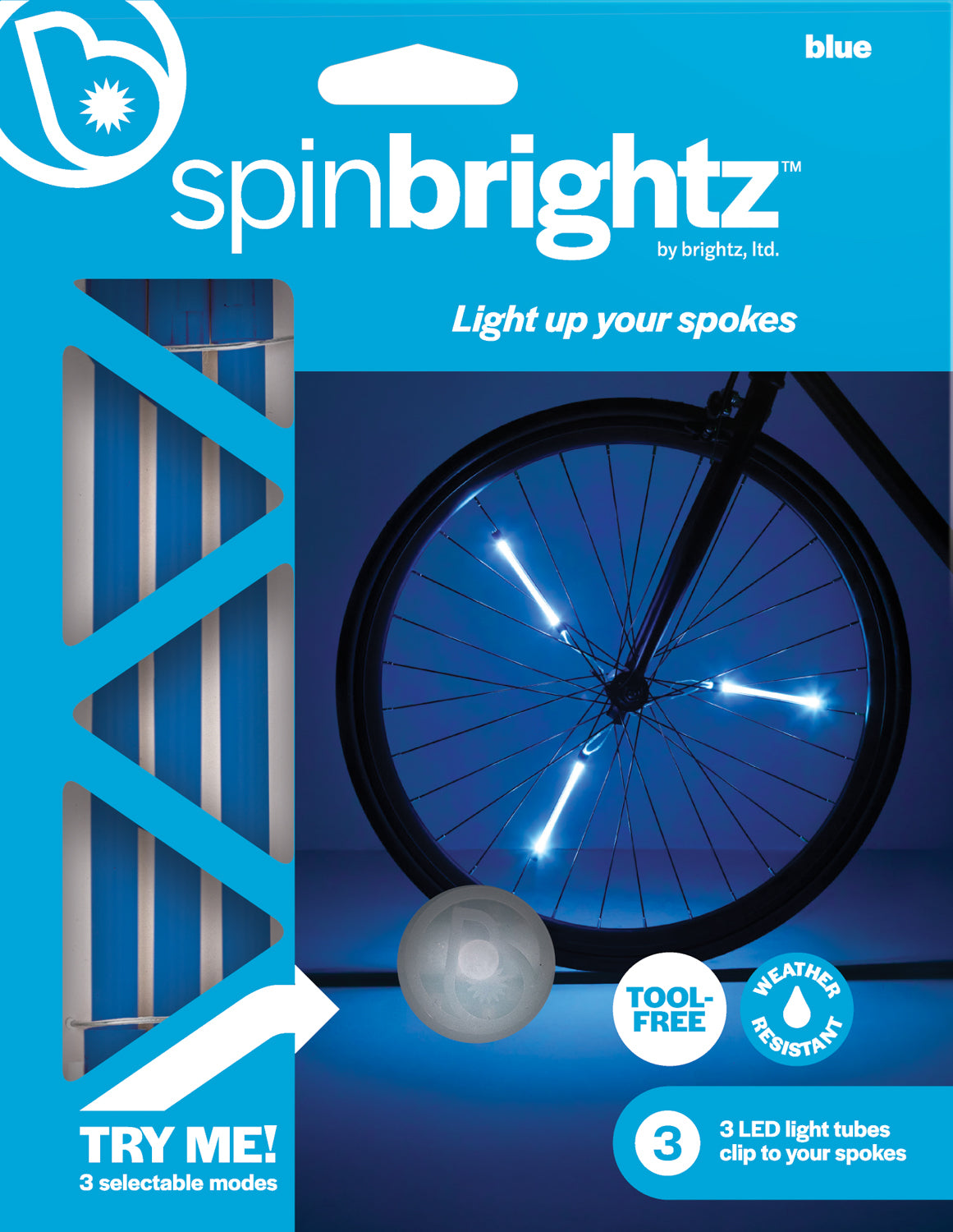 Light up your spokes with Spinbrightz! Three LED tubes create a bright circle of light in your bike wheel! Easy clip-on installation means you're ready to roll in seconds. Once installed, just select one of the 3 flashing options and you're good to go!