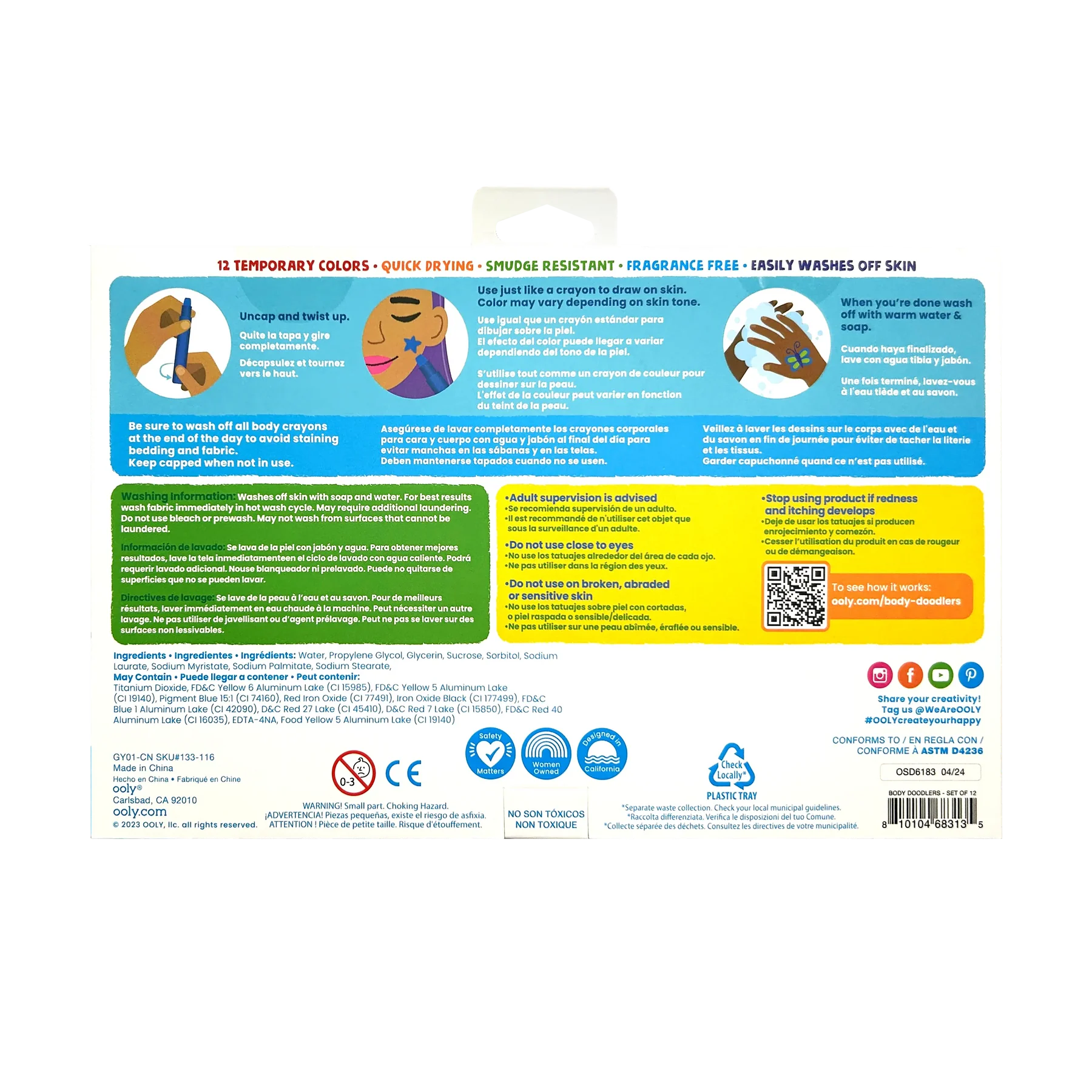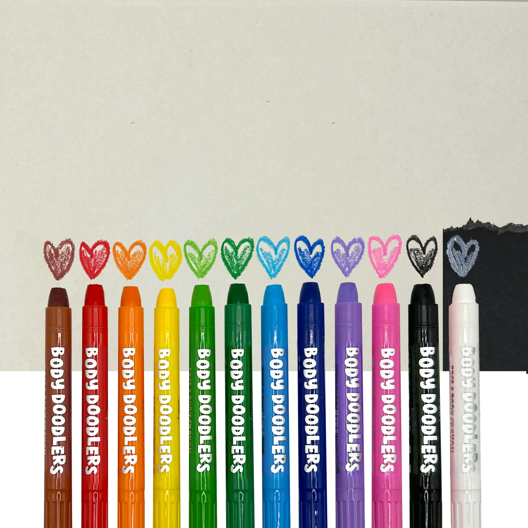 Allow your child to turn themself into a living canvas with colorful body crayons! Super safe for children's skin (even their faces!), this set of 12 crayons takes pretend play time to new heights of imagination. We love the twist-up design, quick-dry application, and that the color washes off easily. Try using them to get into character for Halloween, to make hand puppets with crazy eyes and silly mouths, or just for fun! Set of 12 includes brown, red, orange, yellow, light green, dark green, light blue, dark blue, purple, pink, black, and white.
