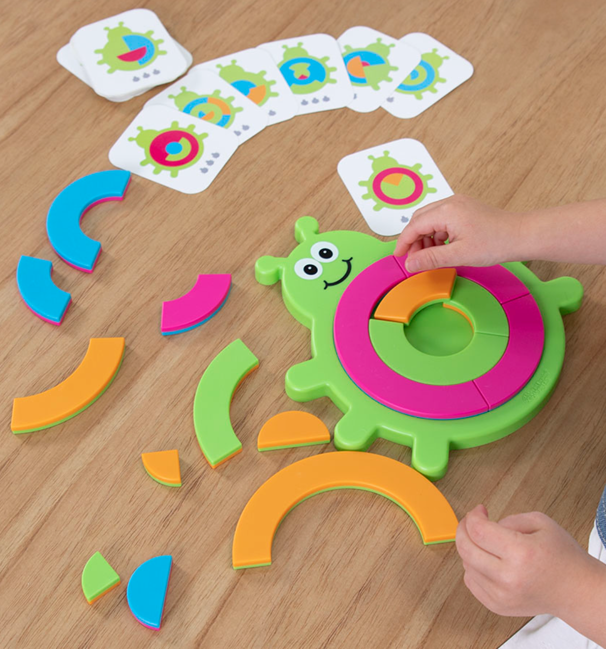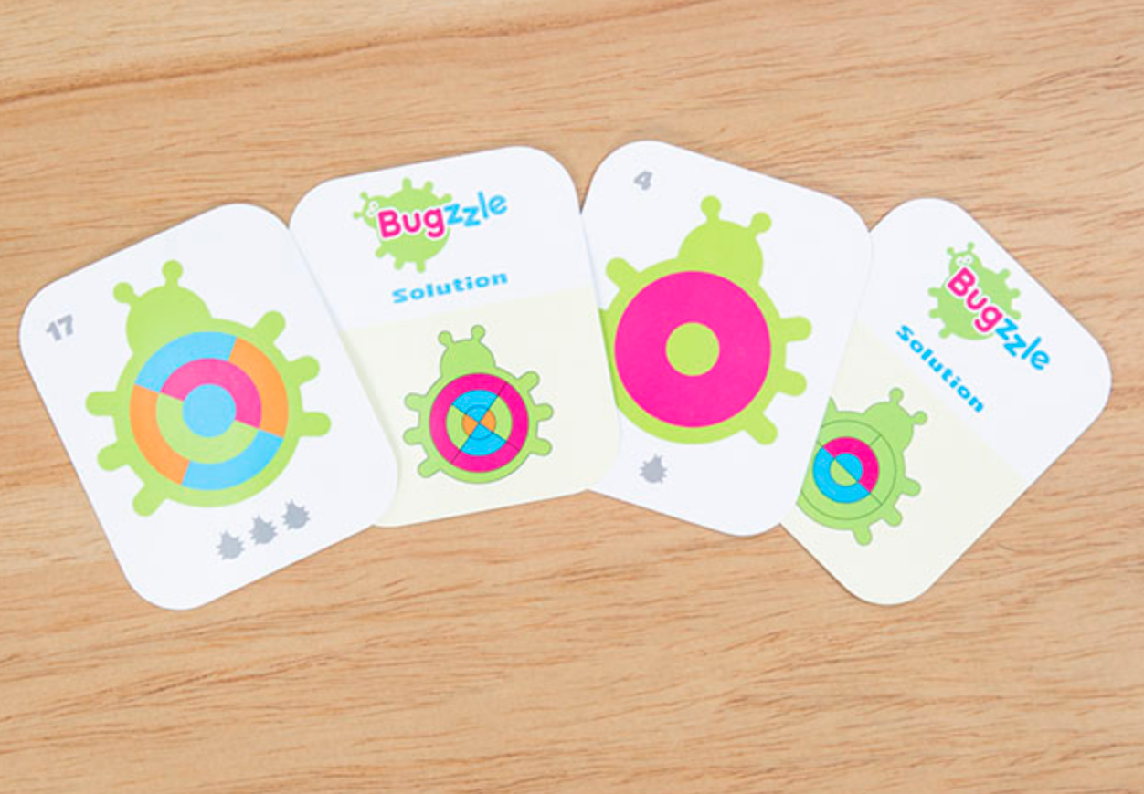 Pick one of the 40 challenge cards and then arrange, flip, and perfectly position the semi-circular puzzle pieces into the bug-shaped tray to match the picture.