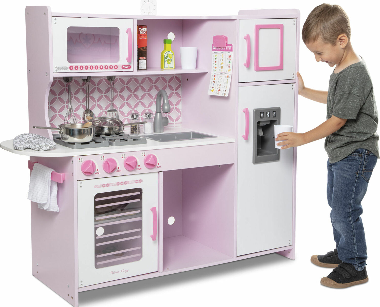 Budding young chefs can hone their craft in this beautifully designed, pretty pink modern play kitchen! Sturdy, top-quality wooden construction means it will stand up to years of creative make-believe meal-making. Standing approximately 3.5 feet (1 meter) long and more than three feet (0.9 meters) high, the chef’s kitchen includes an oven and stovetop with dials that turn, microwave with turning plate, refrigerator with ice maker, freezer, sink, grocery check list, movable hooks, and ample shelving.