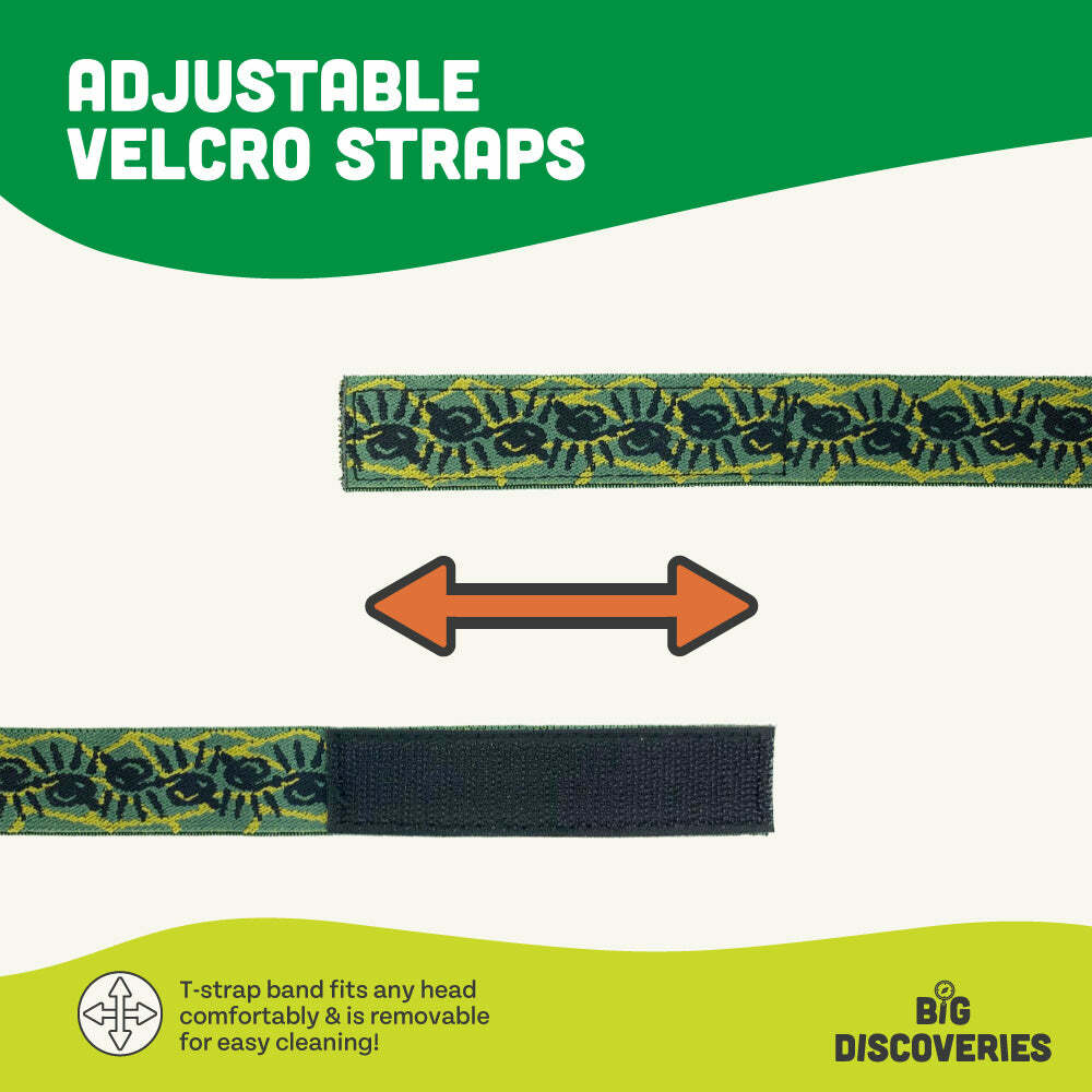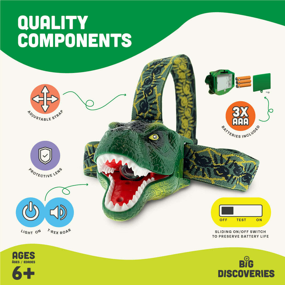 Easily press DinoBryte's jaw to turn on the light and unleash three realistic roars! Once the dinosaur has finished roaring, the headlamp remains illuminated with a bright LED light powered by 3 AAA batteries (included). A protective lens focuses light and keeps the LED from breaking. The adjustable head strap fits both children and adults. Ages 6 and up.