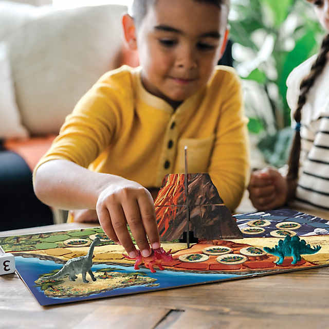 Three dinosaurs are lost in the ferns and a volcano is threatening to blow! Work together to move the dinosaurs around the board. Uncover the matching dinosaurs under the fern tokens to rescue all three dinosaurs. Get the dinosaurs safely to the island before the volcano erupts and everyone wins! Dinosaur Escape allows kids to work together, use their memory, and incorporate simple strategy to rescue the dinos. They love the satisfaction of volcano and of course, playing with dinosaurs. Everyone plays together and everyone has fun! INCLUDES: 3 dinosaur movers, 1 die, 1 game board, 12 fern tokens and 5 volcano puzzle pieces with stand.