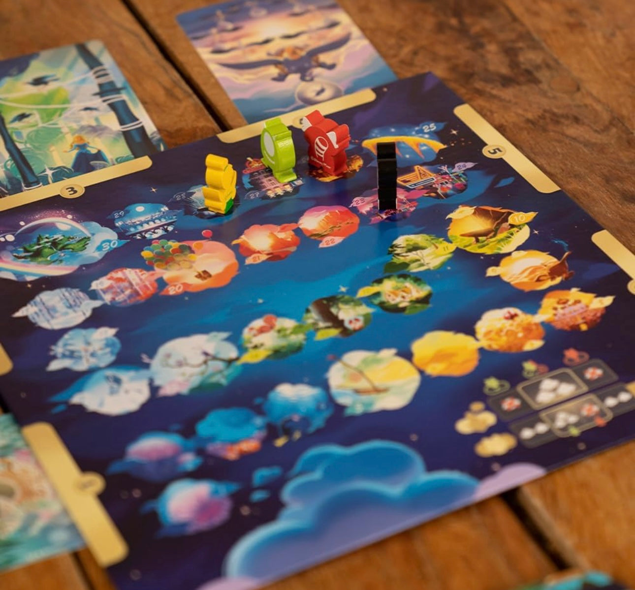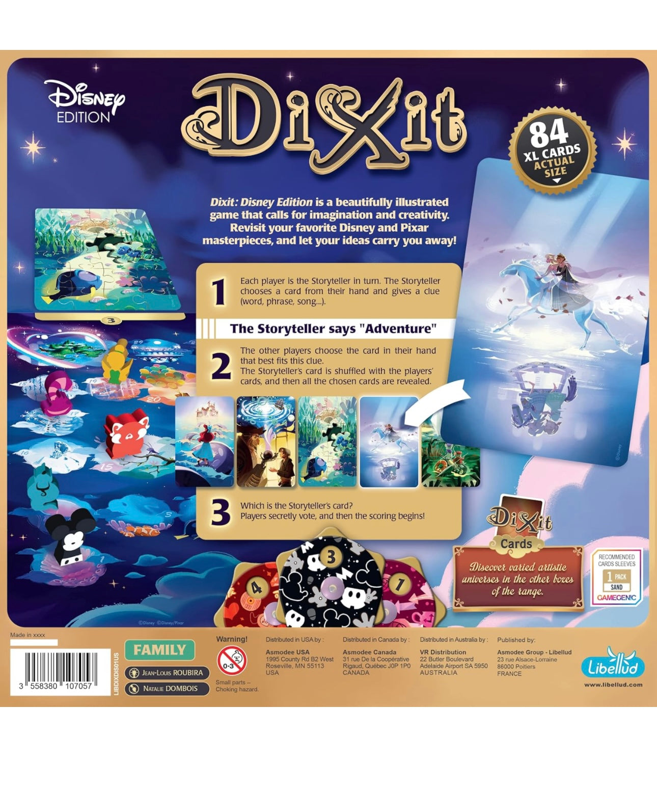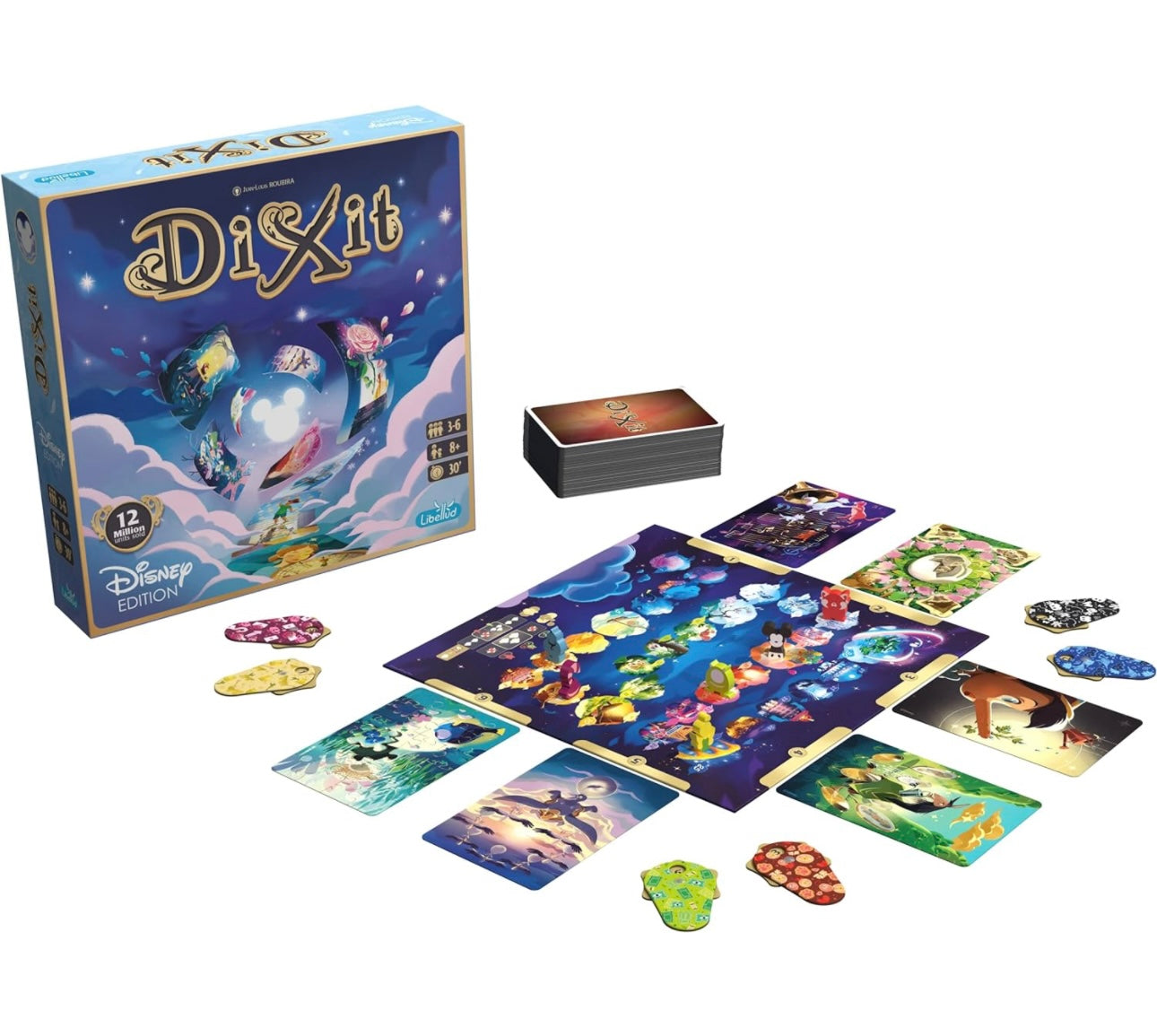 Same rules, with the new material from Dixit for 3 to 6 players: a board, voting dials, wooden meeples… everything beautifully coated with Disney magic.