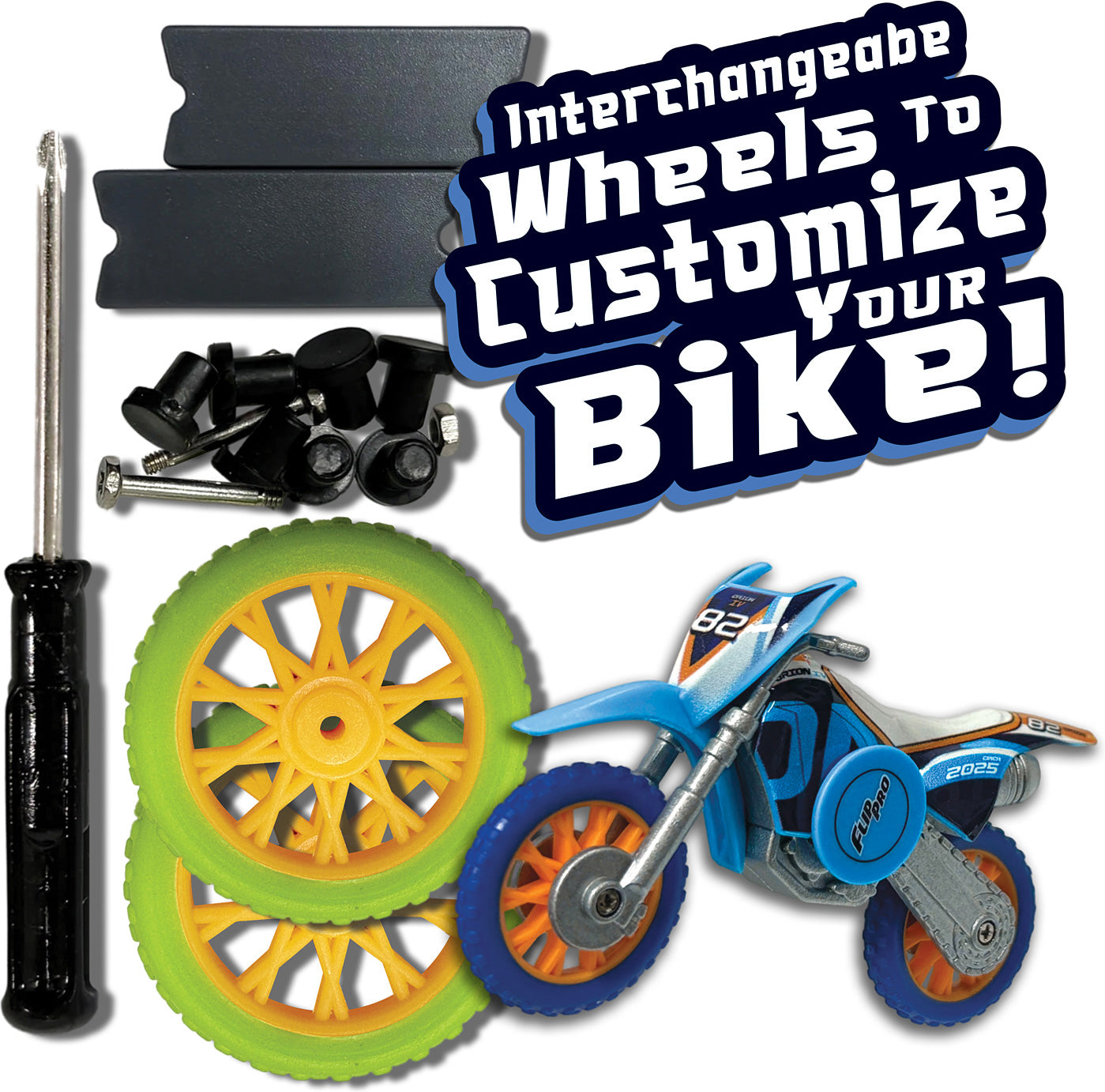 Take playtime to the next level with motorbike stunts, spins, and flips... right in the palm of your kiddo's hand! The innovative design of Flip Pro Spin Bikes combines finger biking with the addictive spin of a fidget spinner for endless trick possibilities. This pack contains a modular skatepark for the ultimate stunt combos - complete with barrels, cones, and ramps. Includes one Flip Pro Spin Bike and interchangeable wheels to customize it. This screen-free social or solo entertainment hones fine motor skills as kids learn to maneuver a high-quality metal and rubber bike. Add more Flip Pro Spin Bikes to your collection for that extra wow factor, each sold separately.