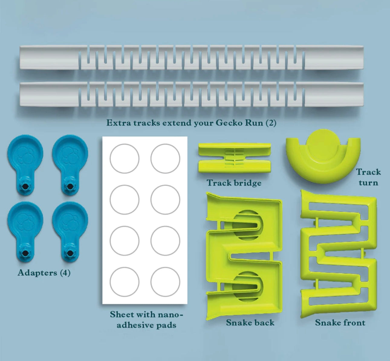 The Snake Expansion Pack comes with over a dozen pieces to complement the Gecko Run Starter Set, including the Snake stunt; additional marbles and nano-adhesive pads; 2 extra tracks; and more.