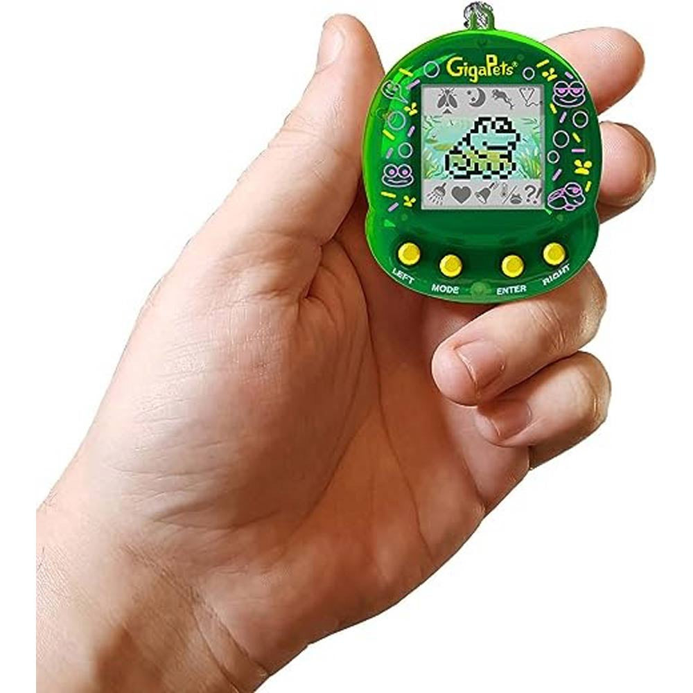 Everyone's favorite digital pets from the 90's are back and better than ever! Embrace nostalgia with GigaPets and help kids learn about caretaking and pet ownership in a low-stakes digital format. Floppy Frog takes kids on a journey from tadpole to adult frog to a surprise evolution! These GigaPets have been upgraded with new animations, better sounds, longer battery life (included), and reusable packaging! Take them everywhere: the classic keychain clips to bags or belt loops. In addition to GigaPet caretaking, you can also play games with them and teach them tricks as they grow.