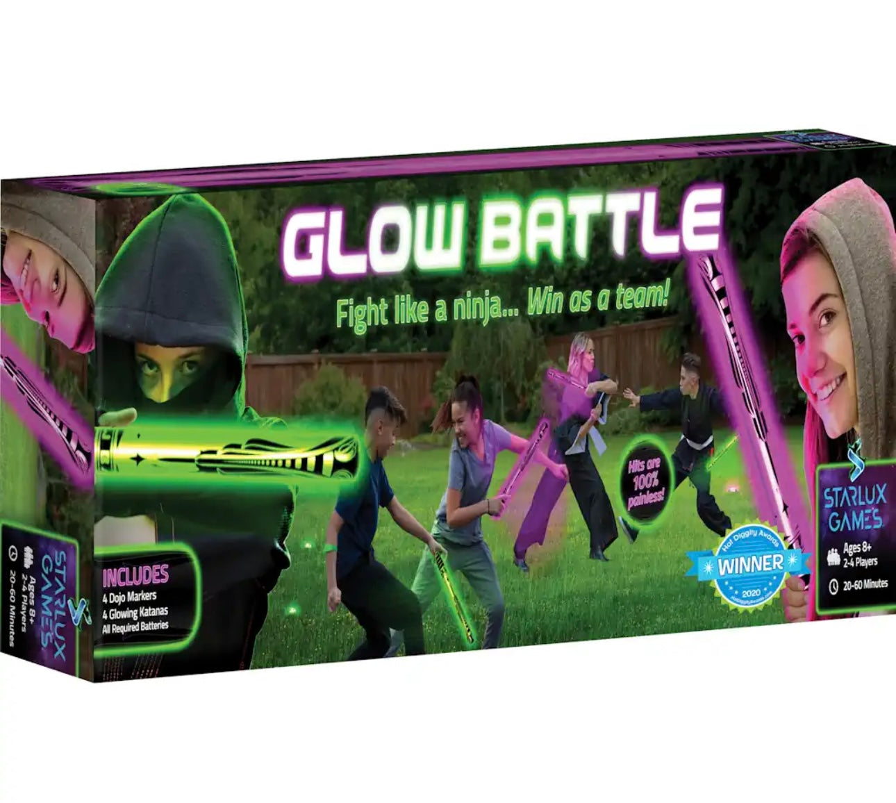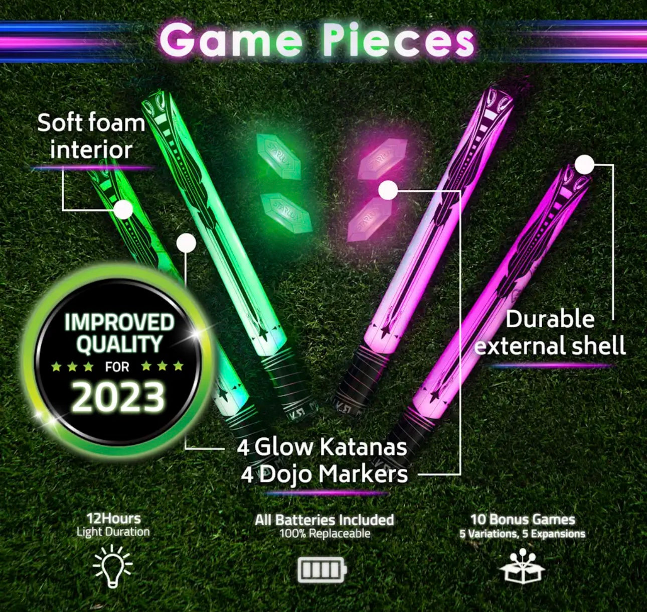 - INDOORS & OUTSIDE: Use inside a basement or garage, or play outdoors at night time, the 4 light-up swords and 4 dojo markers are bright and easy to set up; all batteries included (CR1220 + LR44) for 12+ hours of play