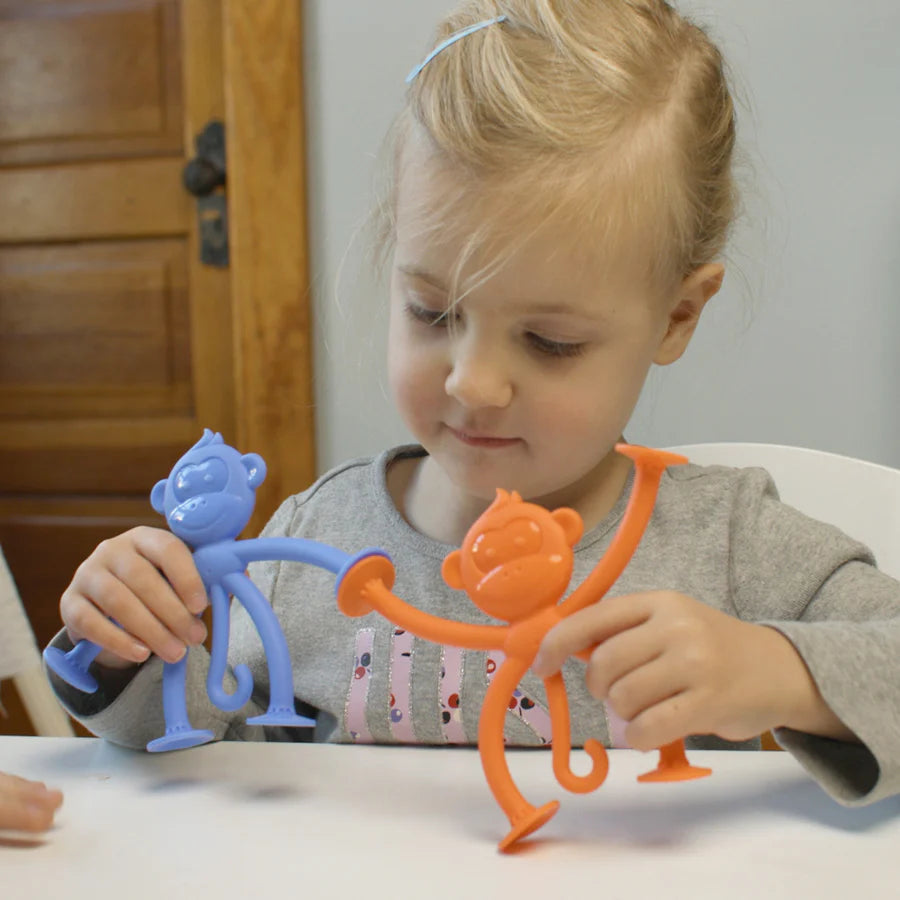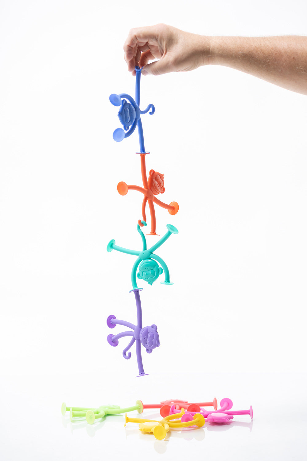 Babies go bananas for these monkey-shaped teethers! Each pack comes with 6 colorful HangaTangs made of textured food-grade silicone. Their hands and feet have suction cups - stick them to surfaces or link them together! We love the versatile play opportunities on high chairs, strollers, in the tub or the car.