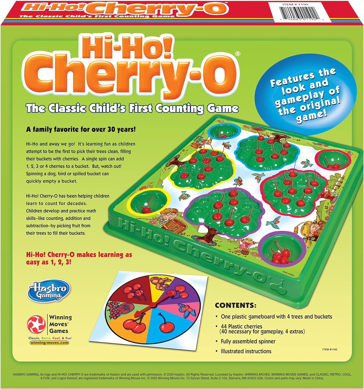 A classic child's counting game for over 50 years! Children develop and practice math skills like counting, addition and subtraction by picking fruit from their trees to fill their buckets. Hi-Ho and away we go! It's learning fun as children attempt to be the first to pick their trees clean, filling their buckets with cherries. A single spin can add 1, 2, 3 or 4 cherries to a bucket. But watch out! Spinning a dog, bird or spilled bucket can quickly empty a bucket.