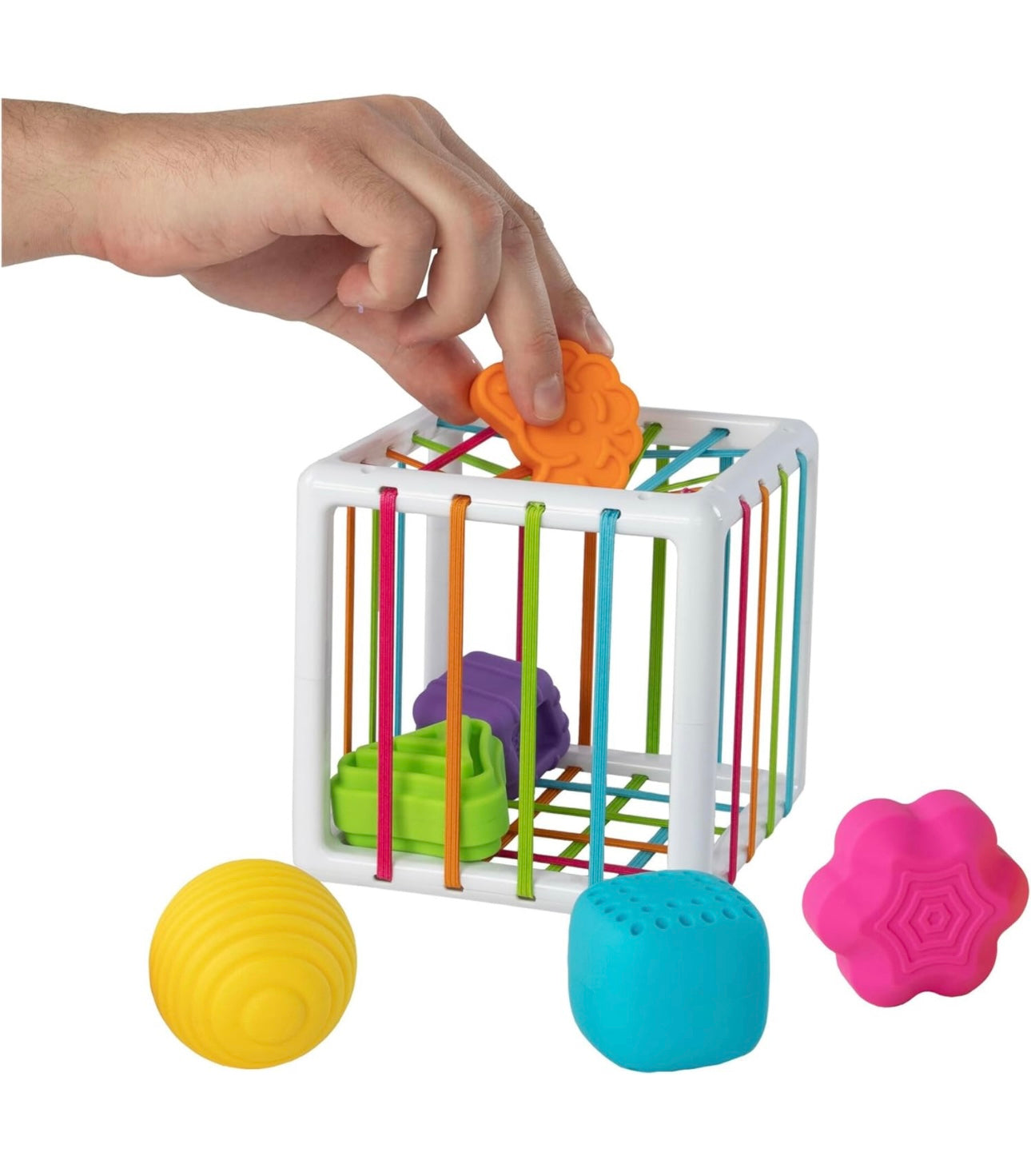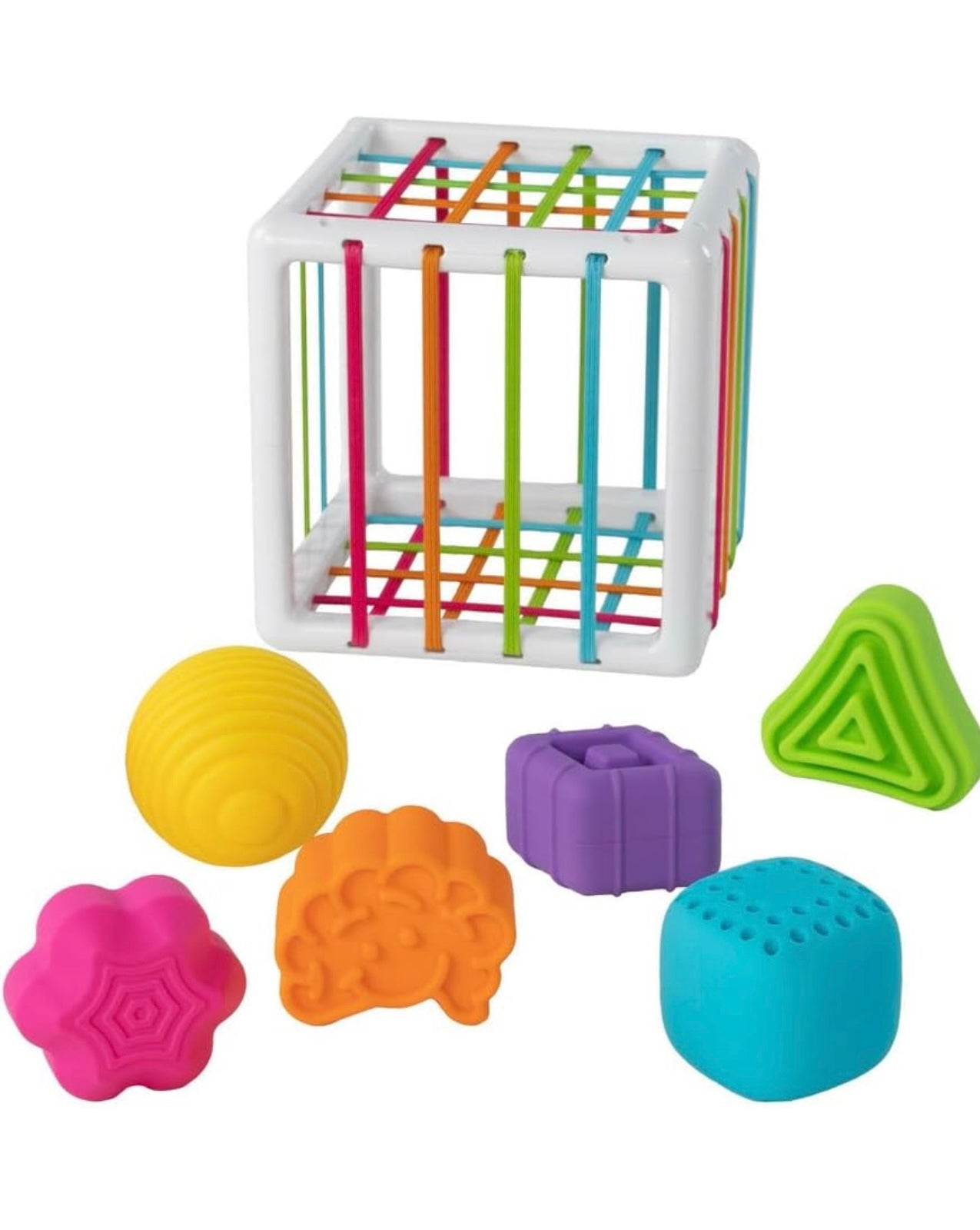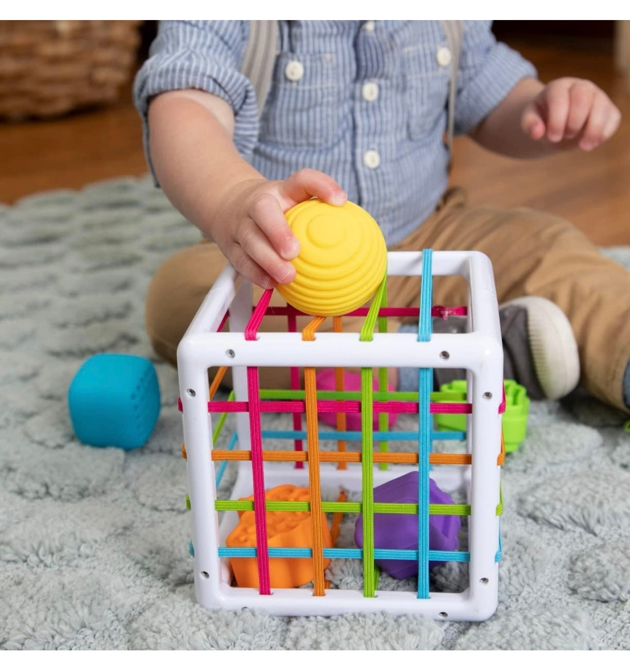 Here are six chunky, textured blocks to delight and challenge little ones as they push each shape through the elastic bands of this cube. In, out, repeat. Each time brings a little more curiosity, joy, and yes, learning.