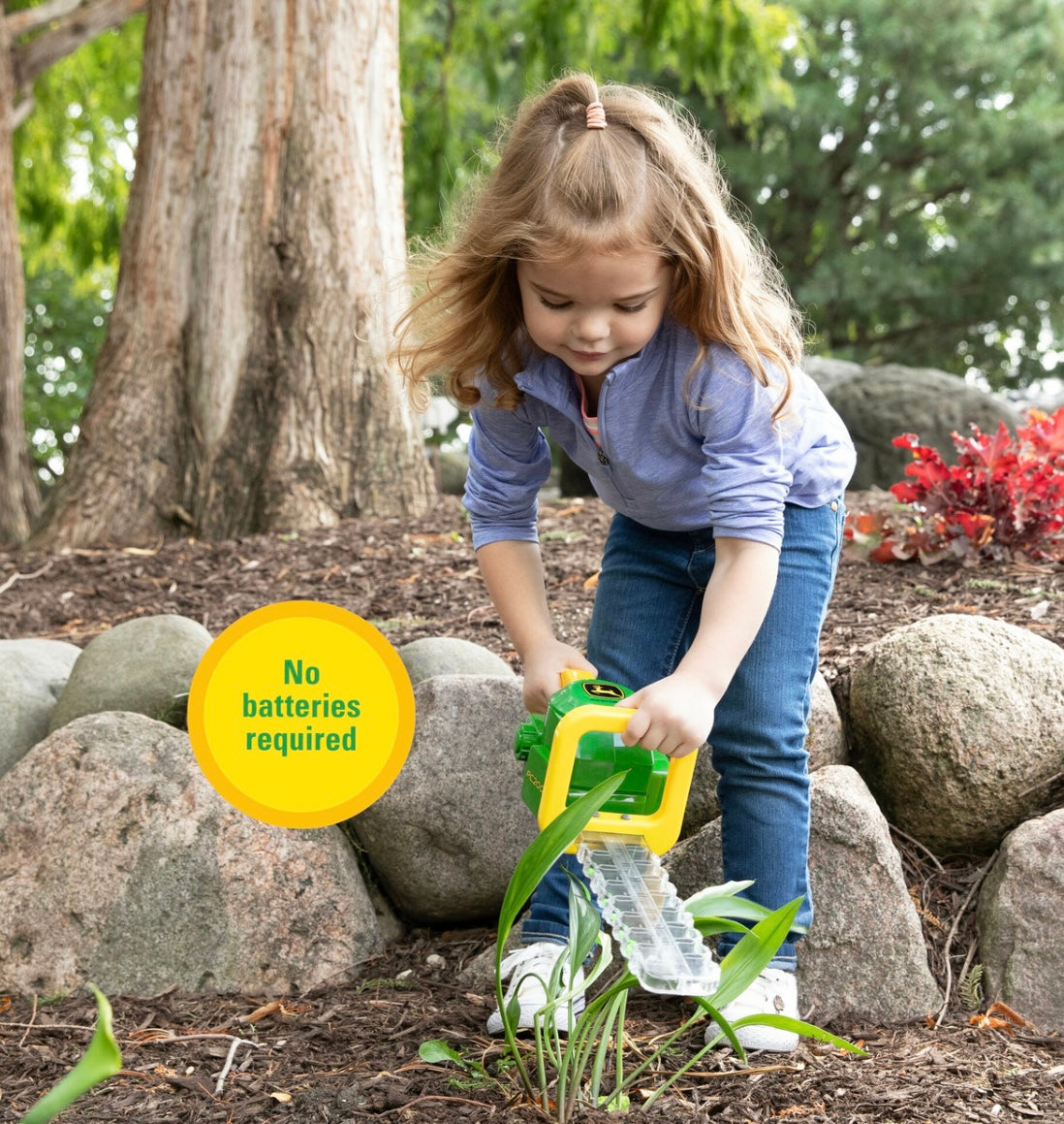 Give young John Deere fans a way to help with the yardwork! This unique and realistic hedge trimmer features brightly-colored, tough plastic construction that is toddler tough. Kids pull the cord to wind up and start the action. Pull the trigger to agitate the "clippings" in the hedge trimmer. This backyard toy is all kid powered fun - no batteries required. Give toddlers ages 18 months and up a yard tool toy for outdoor fun!