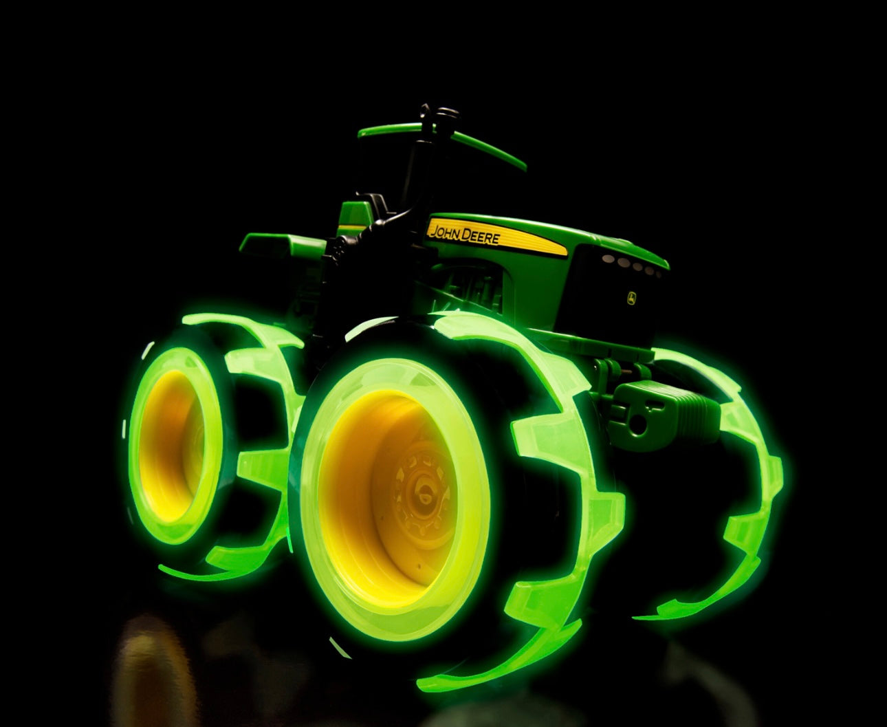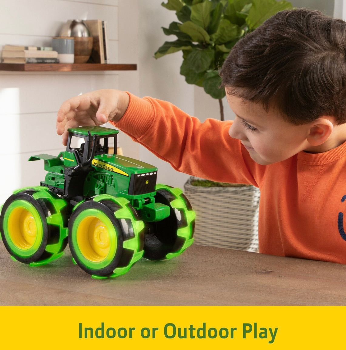 Light up your off-road adventures with this John Deere Monster Treads Lightning Wheels Tractor by TOMY! Simply roll the tractor to activate the super cool light up wheels and see the green LED lights come to life! Measuring 9" long, 6" wide, and 8" tall, this monster tractor is ready to topple anything that lies in its path. Batteries are included so that the fun can start right away!