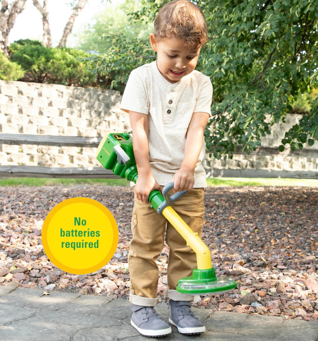 Give young John Deere fans a way to help with the yardwork! This unique and realistic weed trimmer features brightly-colored, sturdy plastic construction that is toddler tough. Kids can start this yard toy themselves by pulling on the cord. A simple press of the button creates weed clipping action. This backyard toy is all kid powered fun - no batteries required. Give toddlers ages 18 months and up a yard tool toy for outdoor fun!
