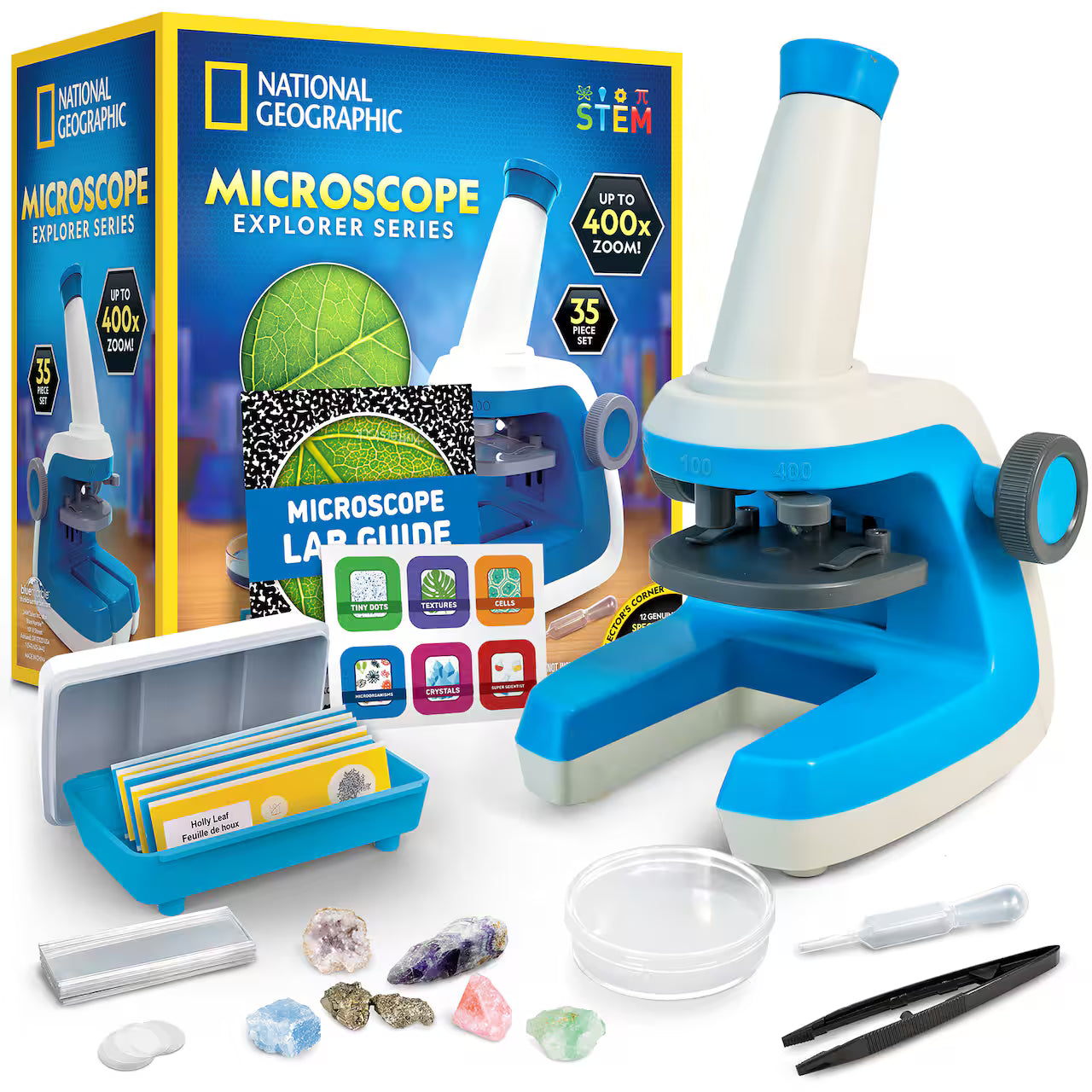 The National Geographic Microscope Starter Kit is one of the most thoughtfully designed beginner microscopes you'll find. It's built specially for younger kids, with a fixed eyepiece and a slide platform that moves up and down as you adjust the focus. The microscope offers up to 400x magnification and is equipped with an internal mirror system that provides a true view of your samples. A convenient slide storage container is integrated into the base of the microscope and the microscope operates using 3 AAA batteries. You'll get a range of accessories including prepared slides, blank slides, tweezers, and more! This is a fantastic starter science set that unlocks the wonders of the microscopic world!