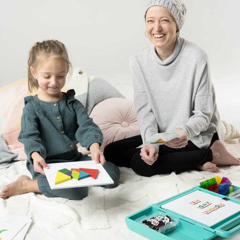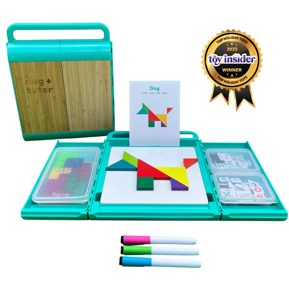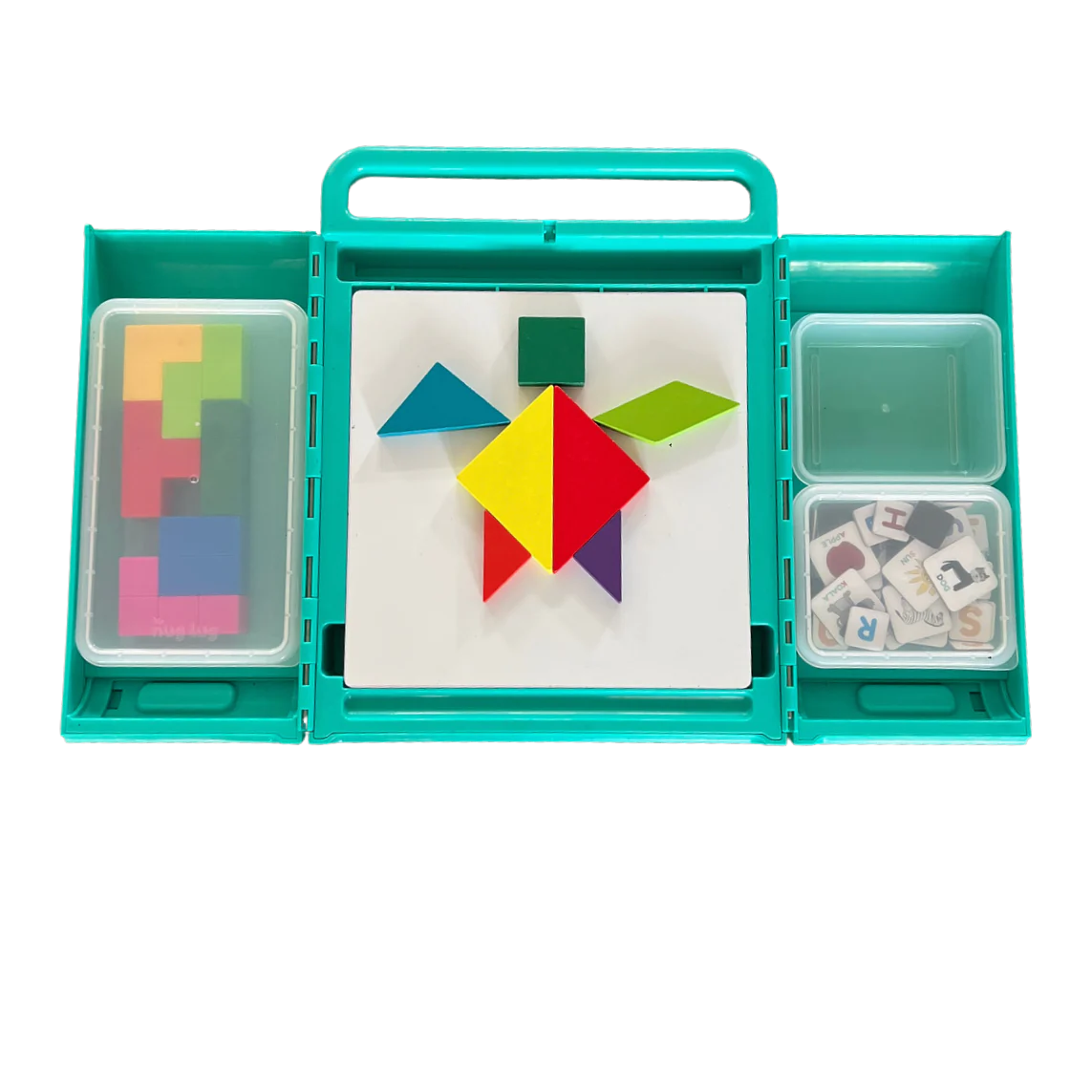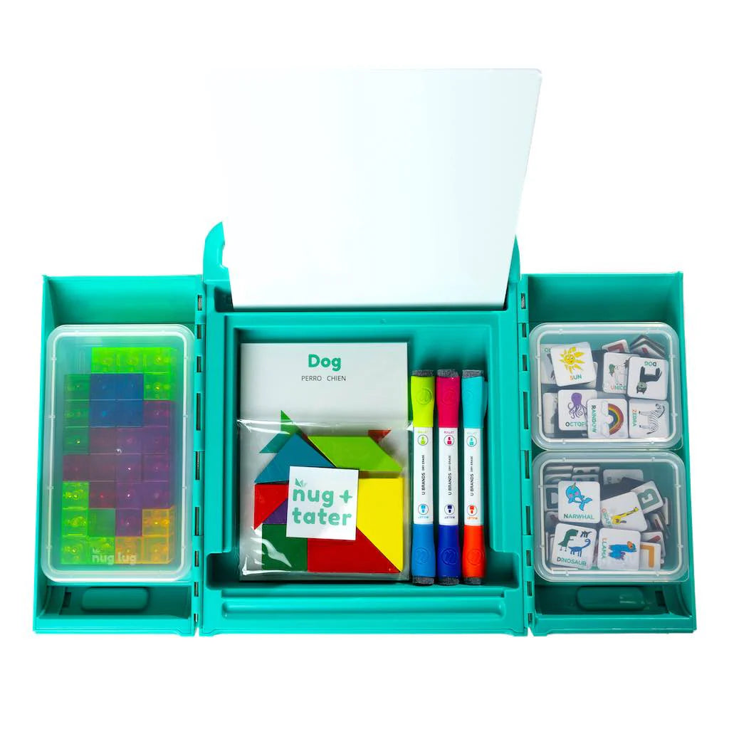 The NugLug is a portable educational system designed to stimulate the intellectual curiosity of a child. Intentionally designed as a screen-free activity, it provides for hours of creative play. The modular design allows for interchangeable activities to accommodate a range of ages and interests. The NugLug includes a whiteboard for drawing and game play, alphabet tiles, tangram puzzles and 3-dimensional magnetic building blocks. The food grade containers can also be used to pack snacks for families on-the-go.