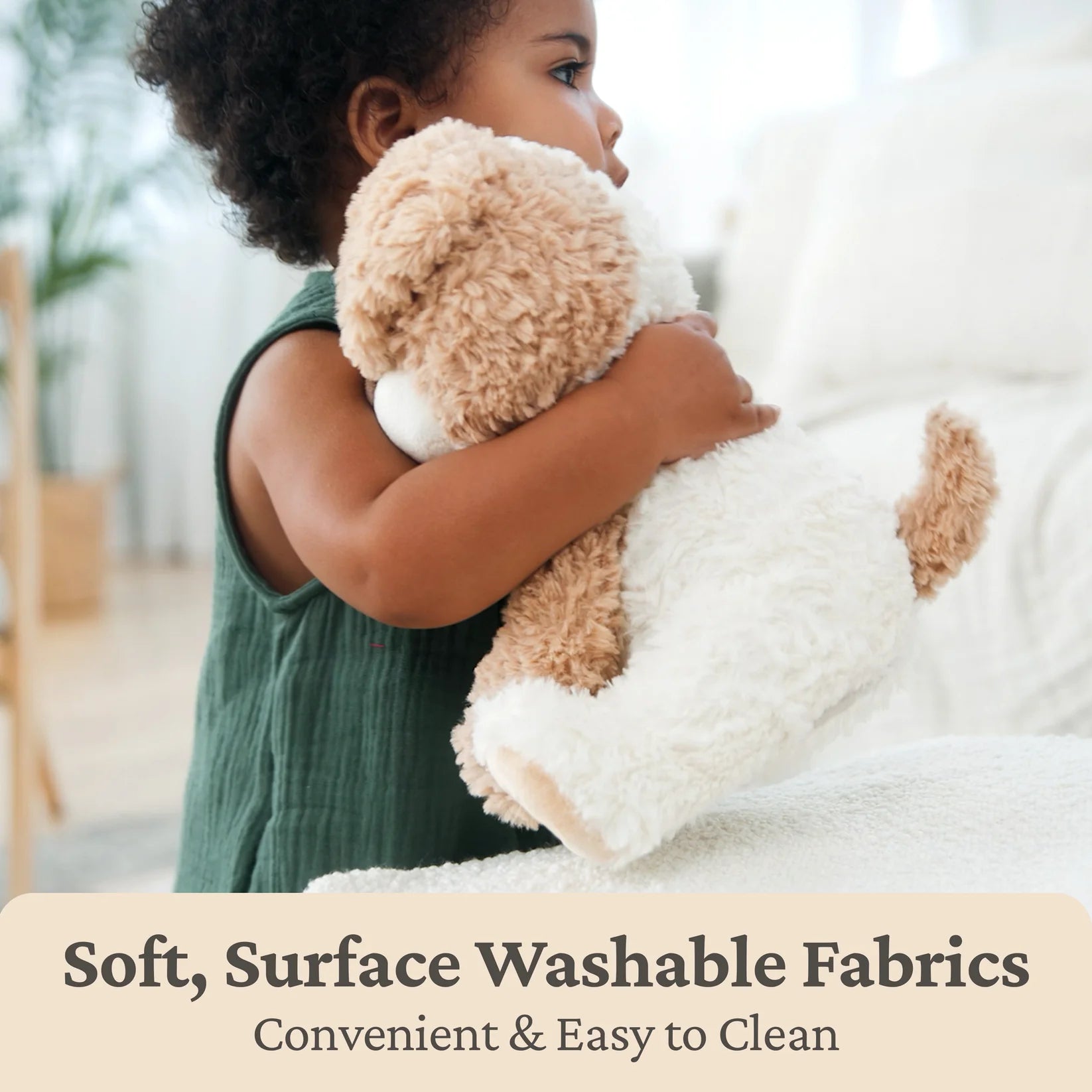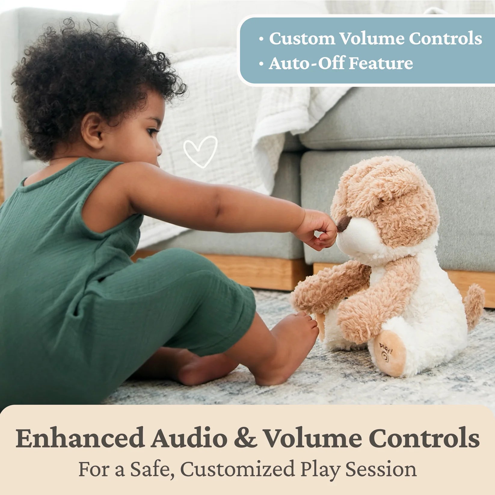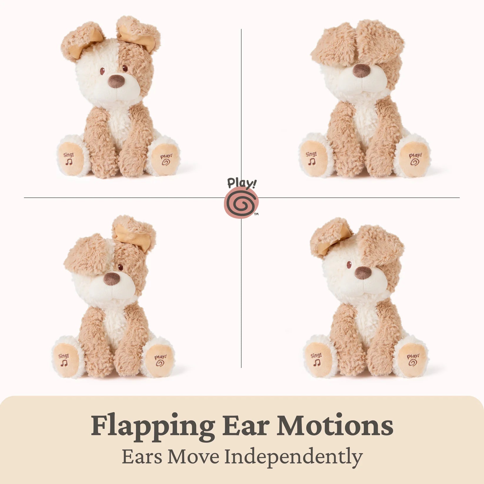 Sing, snuggle, and play peek-a-boo with this cuddly plush animated pup! Peeki sits at an adorable 12" tall, ready for playtime with baby. Press his right paw to start a game of peek-a-boo, where Peeki uses his ears alternately to cover his eyes and cause lots of giggles. Press his left paw to hear a unique song! With safe features like custom volume controls and an auto-off feature, this innovative plush toy makes the perfect baby shower gift! Includes 2 AA batteries.