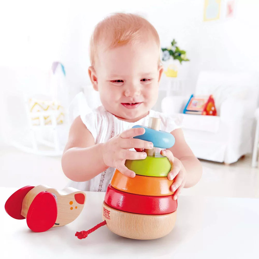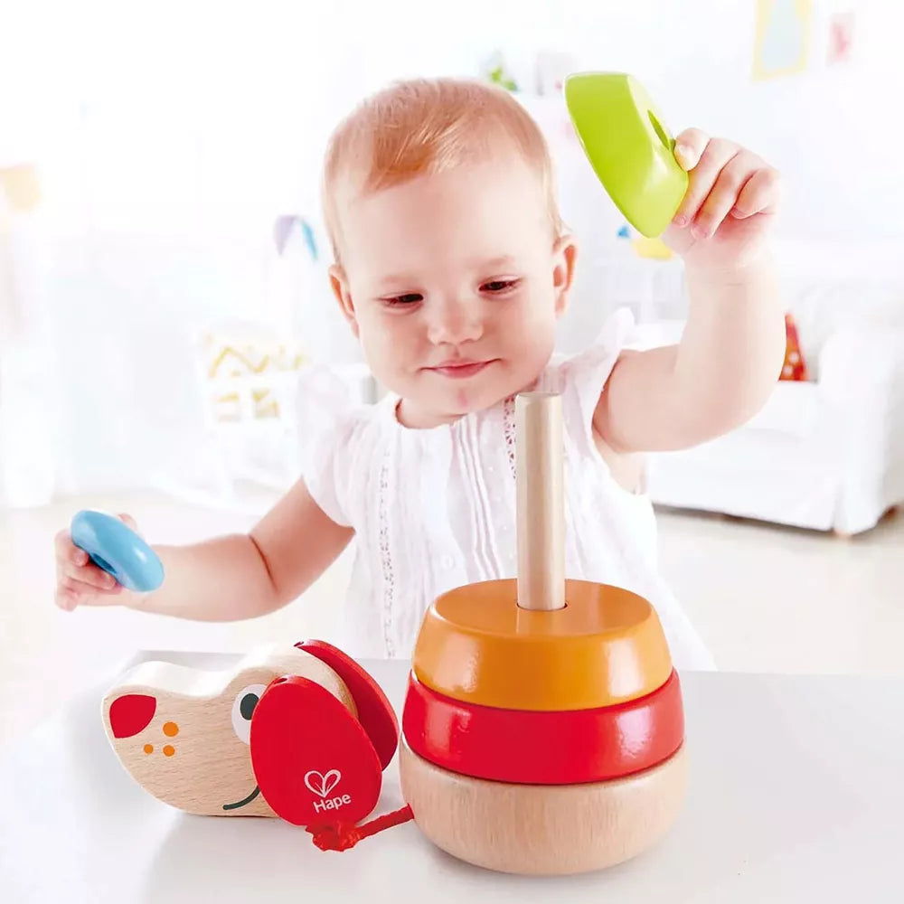 This stackable and colorful puppy helps children identify different shapes and colors, as well as barks when his head is knocked.