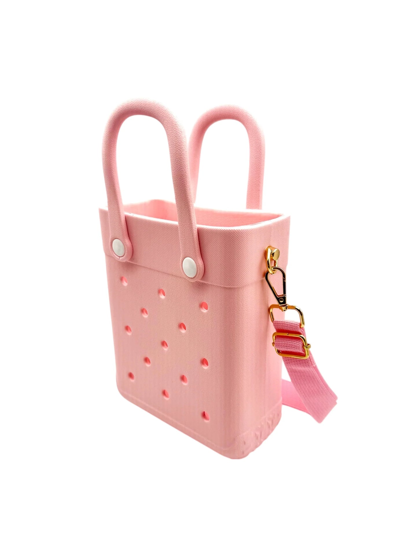 These charm bags are perfect for a day out and about! These are a mini version of the popular beach charm bags. The holes fit standard jibbitz charms. The adjustable strap allows you to wear it at any length.