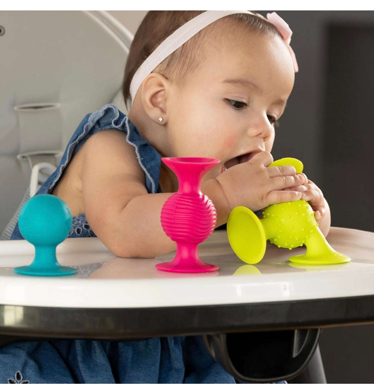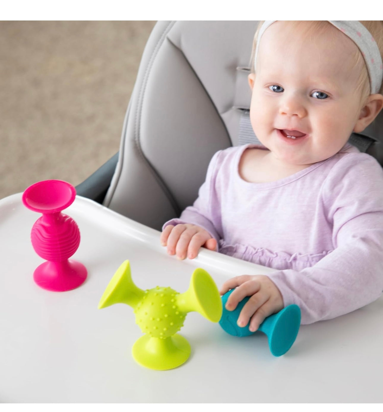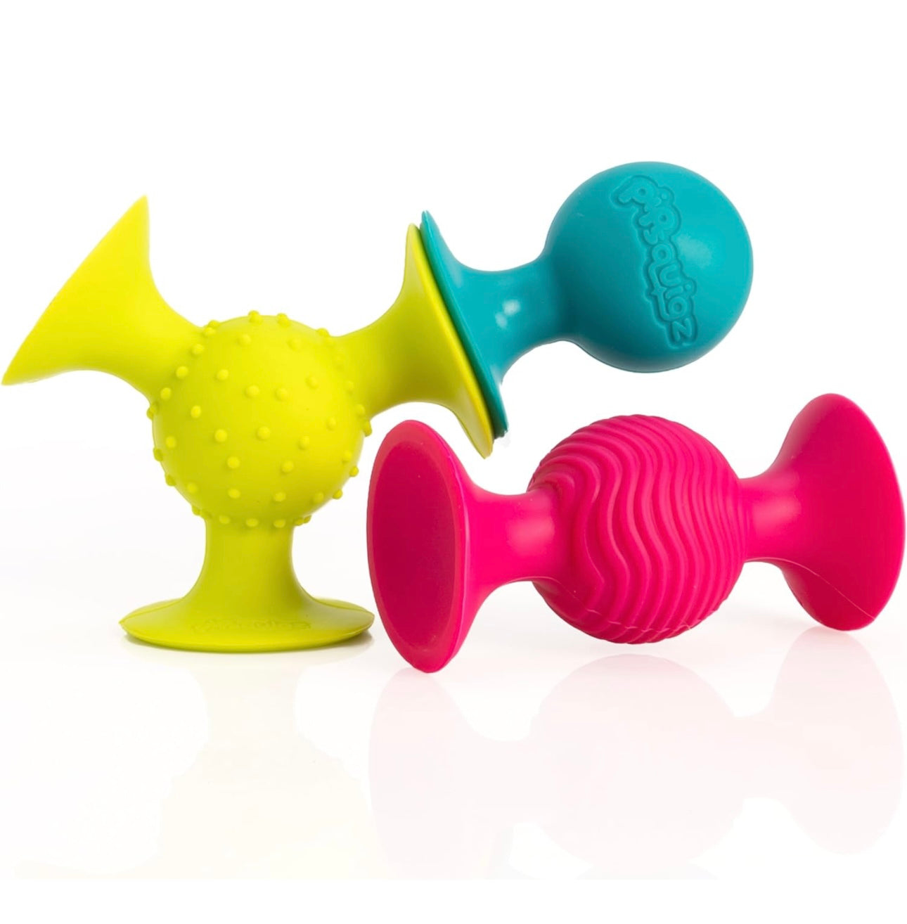 Our set of three little suckers works as a suction toy on strollers, high chairs and in the bath. Babies delight in the movement, sound and texture, encouraging exploration and sensory awareness. Made of silicone, BPA free, and dishwasher safe. For ages 6-18 mos.