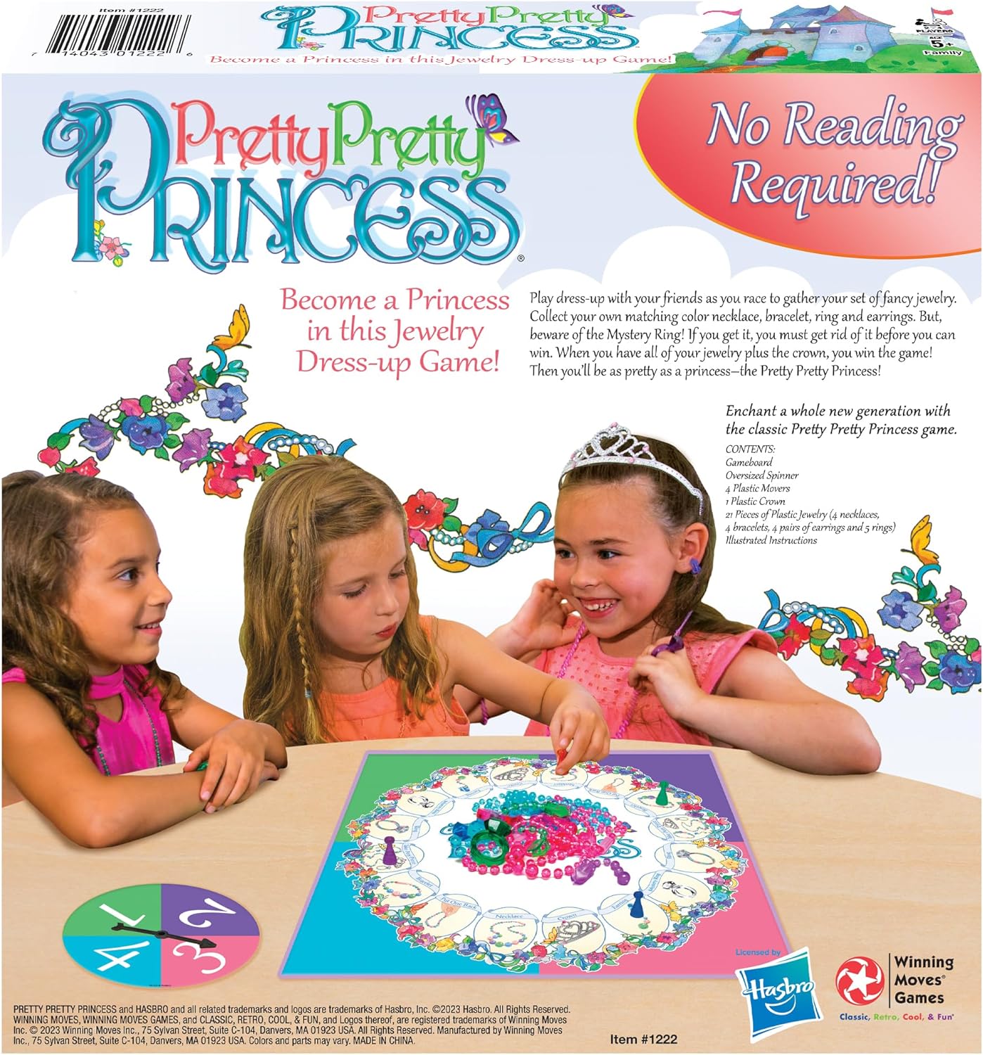 In this delightful dress-up game, players work together quickly to gather the fanciest jewelry. Collect necklace, bracelet, ring and earrings, plus the matching color crown, all sized for players to put on as the game progresses. For 2-4 players.