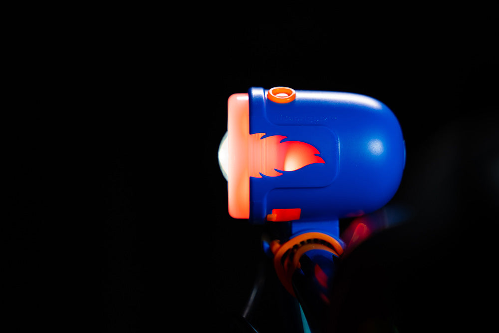 Your bike? Gonna be fire! Illuminate your way through the night with this LED headlight and red taillight combo. The colorful headlight has two brightness levels and a flashing mode. Even cooler? The exterior light ring morphs into red hot flames or stops on a color when it meets the ground. Low level brightness lasts up to 15 hours per charge. Weather-resistant. No tools required. USB rechargeable with micro-USB port (cord not included).