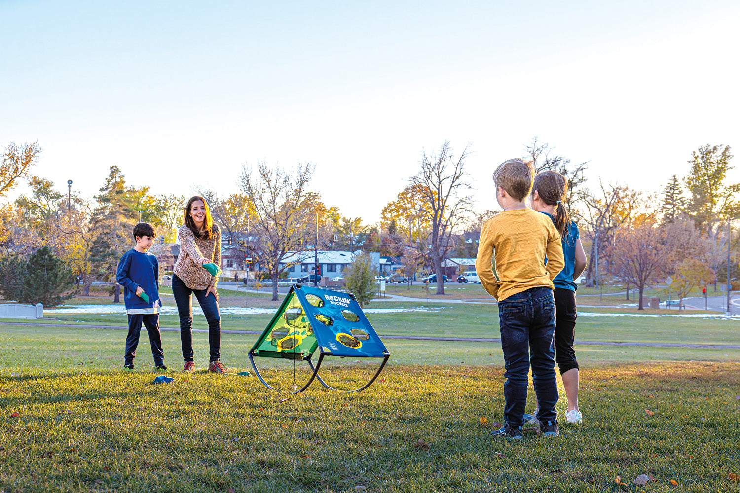 Inspired by the classic game of cornhole, Rockin' Pockets introduces an exhilarating rocking mechanism to amp up the fun indoors or outdoors. Players face off from opposite sides and simultaneously toss their 6 bags towards the pockets. Each successful throw tips the scale, causing the target to rock towards the player's direction. The last bag is twice as heavy, so throw carefully! Points are scored based on the target's leaning angle after each round and the first player/team to 25 points wins. For 2-4 players.