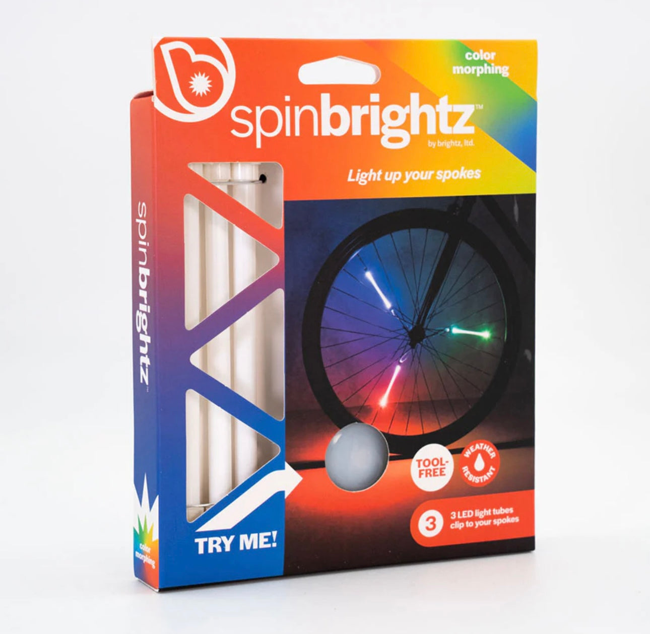 Make every night ride a party with SpinBrightz on your wheels! Easily attach three weather-resistant light tubes to each wheel and ride through the night on a wheel of light! Includes 3 LED light tubes and attached battery pack for 1 bike wheel. Diamond-bright LEDs last for 20+ hours. Solid colors have 3 selectable modes for different flashing light patterns. Quick and easy clip-on installation. Weather-resistant. Easily replaceable 2 CR2032 (3V) batteries included.