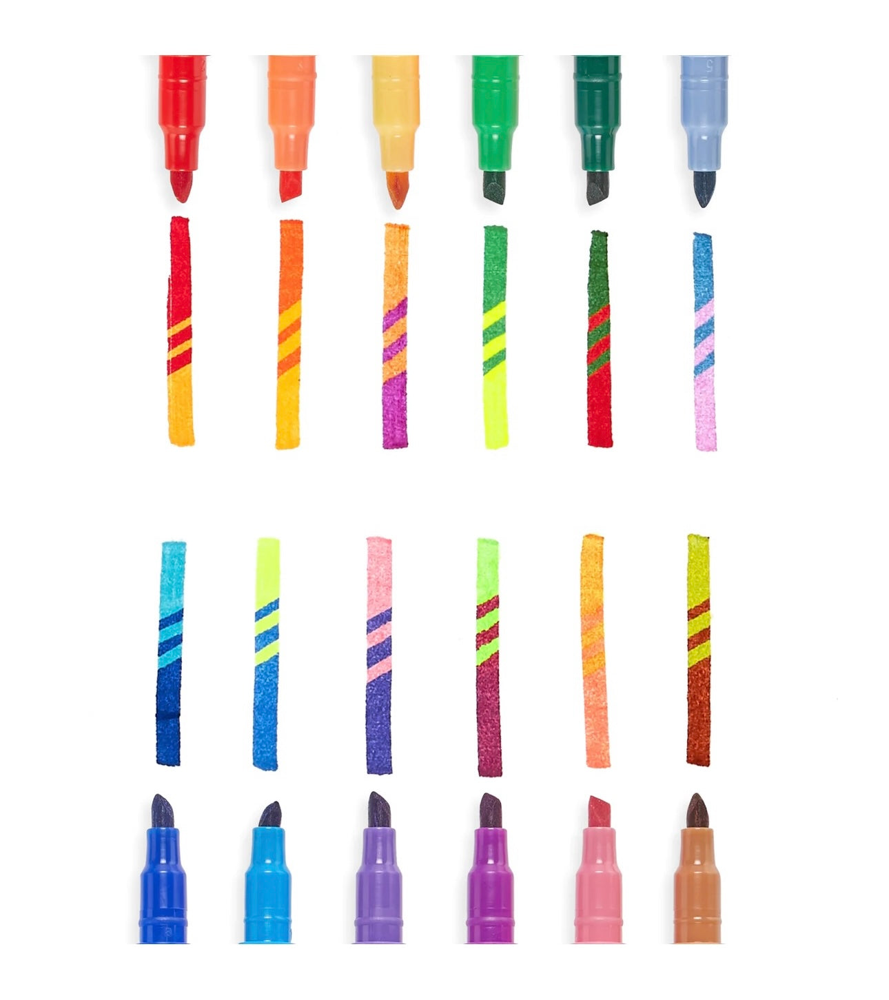 This set of twelve color markers comes with chiseled tips for both thick and thin strokes. Color boldly and then change it up in a different way each time. Just use any of the white ends to draw or color over your colored in area. Make mystery color change designs or turn your entire piece of art on its head by changing everything. Watch wonder unfold as you create a new masterpiece with these one of a kind color markers.