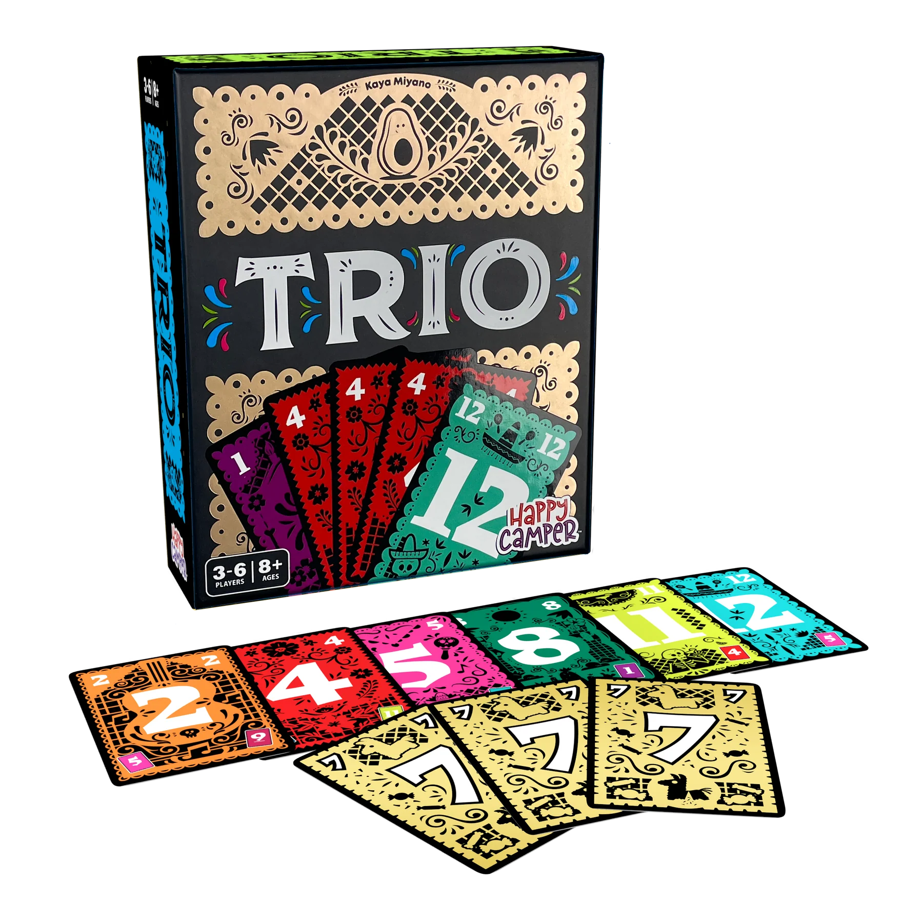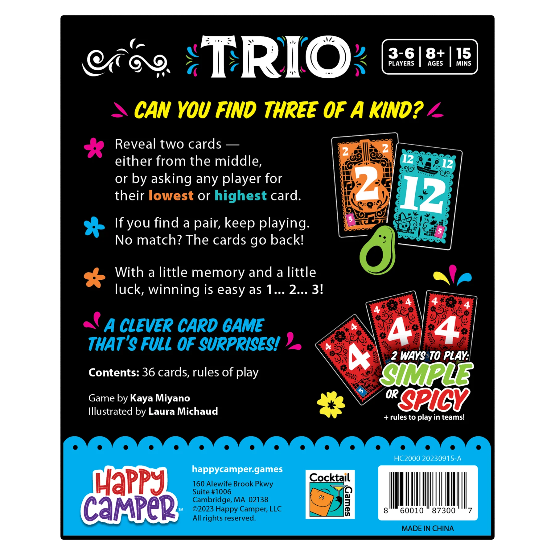Your new favorite card game is here! Can you find three of a kind? Reveal two cards: from the middle, or by asking any player for their lowest or highest card. If it's a numerical pair, keep playing. Get three of a kind and collect the trio. But if the numbers don't match, the cards go back! With a little memory and a little luck, winning is easy as 1... 2... 3! Play in simple mode, or turn up the challenge heat in spicy mode. We love the quick 15 minute gameplay, and that Happy Camper donates a portion of their profits to fund summer camp scholarships. For 3-6 players.
