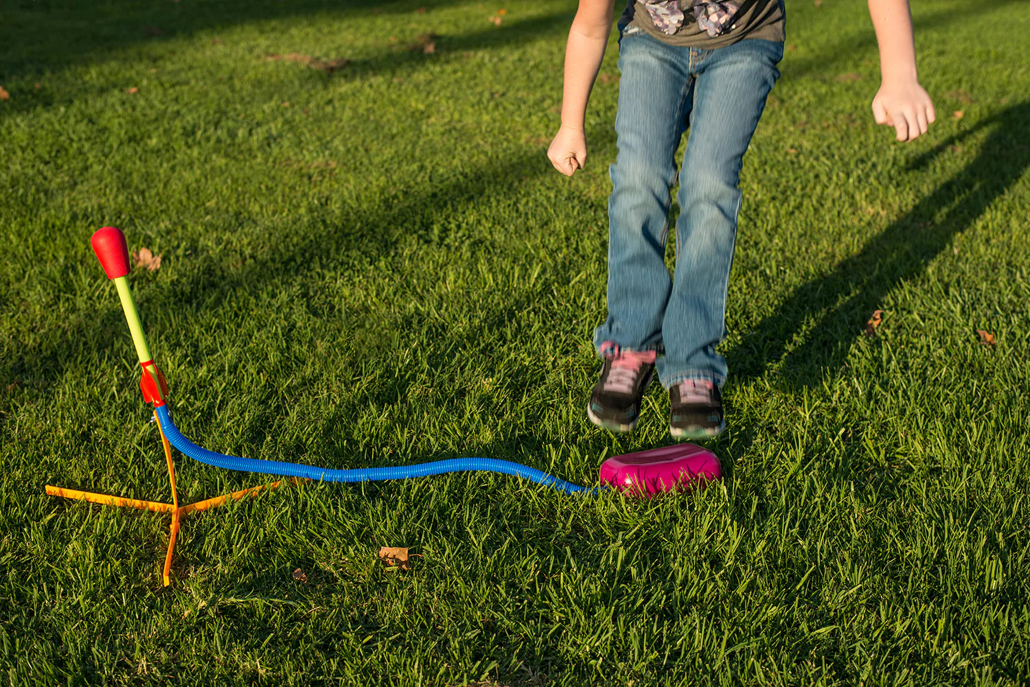 Run, Jump, STOMP to launch light-up LED rockets up to 150 feet in the air.
